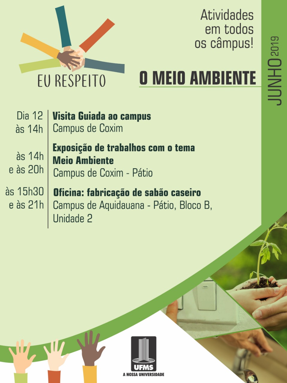 Hoje, dia 12, os câmpus de Coxim (CPCX) e Aquidauana (CPAQ) planejaram um dia inteiro de atividades que integram a programação da campanha Eu Respeito do mês de junho, que possui o tema o meio ambiente.