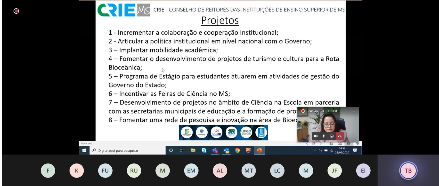 Realizada de forma virtual, participaram da reunião os reitores: do IFMS, Elaine Borges Monteiro Cassiano; da UFMS, Marcelo Turine; da UCDB, Pe. José Marinoni; da UEMS, Laércio Alves de Carvalho; a pró-reitora de Extensão e Cultura, Josiane de Freitas representando a UFGD, além de assessores.