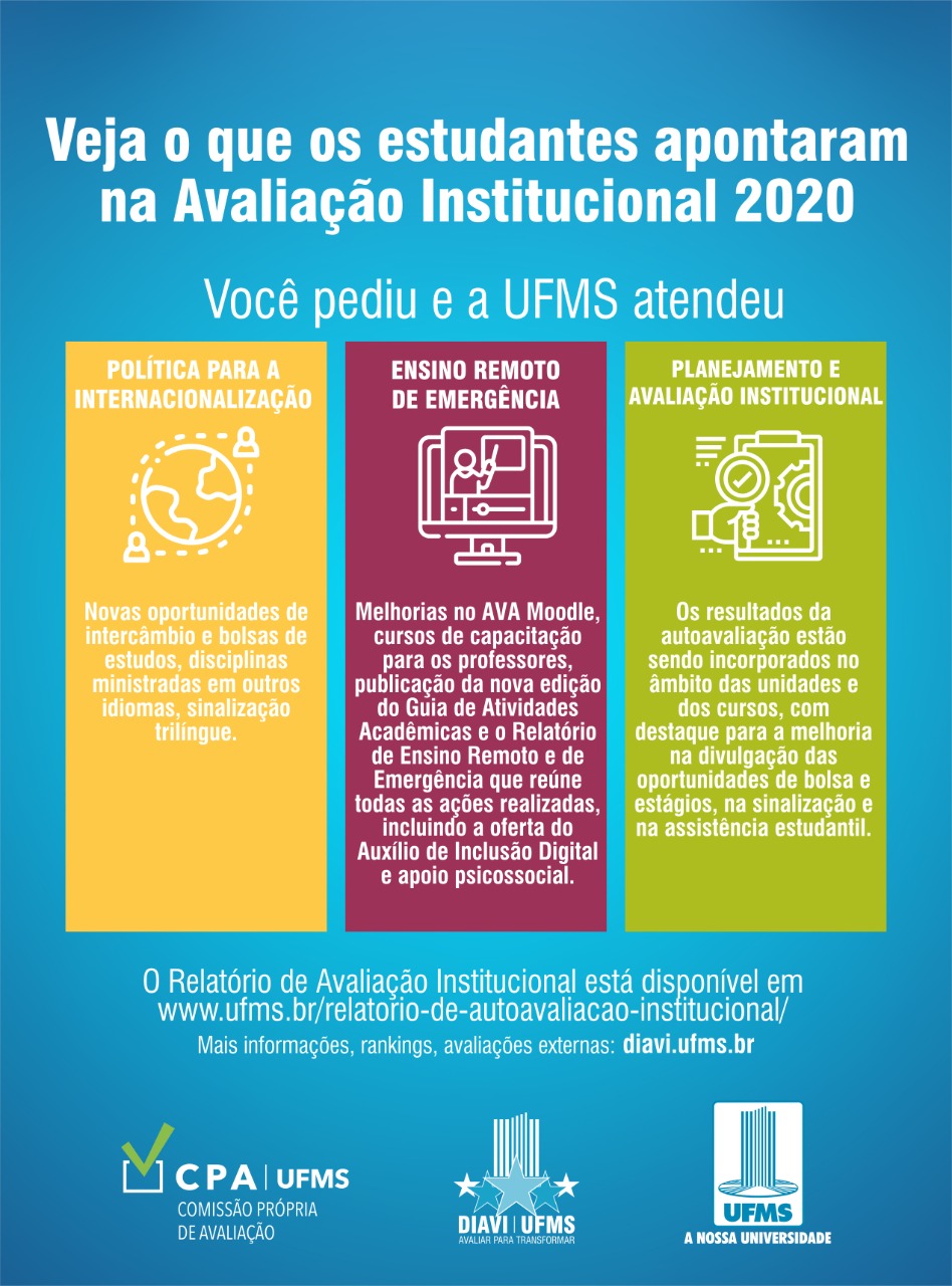 A Avaliação Institucional da UFMS traz a percepção de estudantes, técnicos-administrativos e docentes quanto ao desenvolvimento de suas atividades. O Relatório referente ao triênio 2018-2020 foi disponibilizado pela Comissão Própria de Avaliação (CPA) neste link, no site da Diretoria de Avaliação Institucional (Diavi), que apoia a realização.