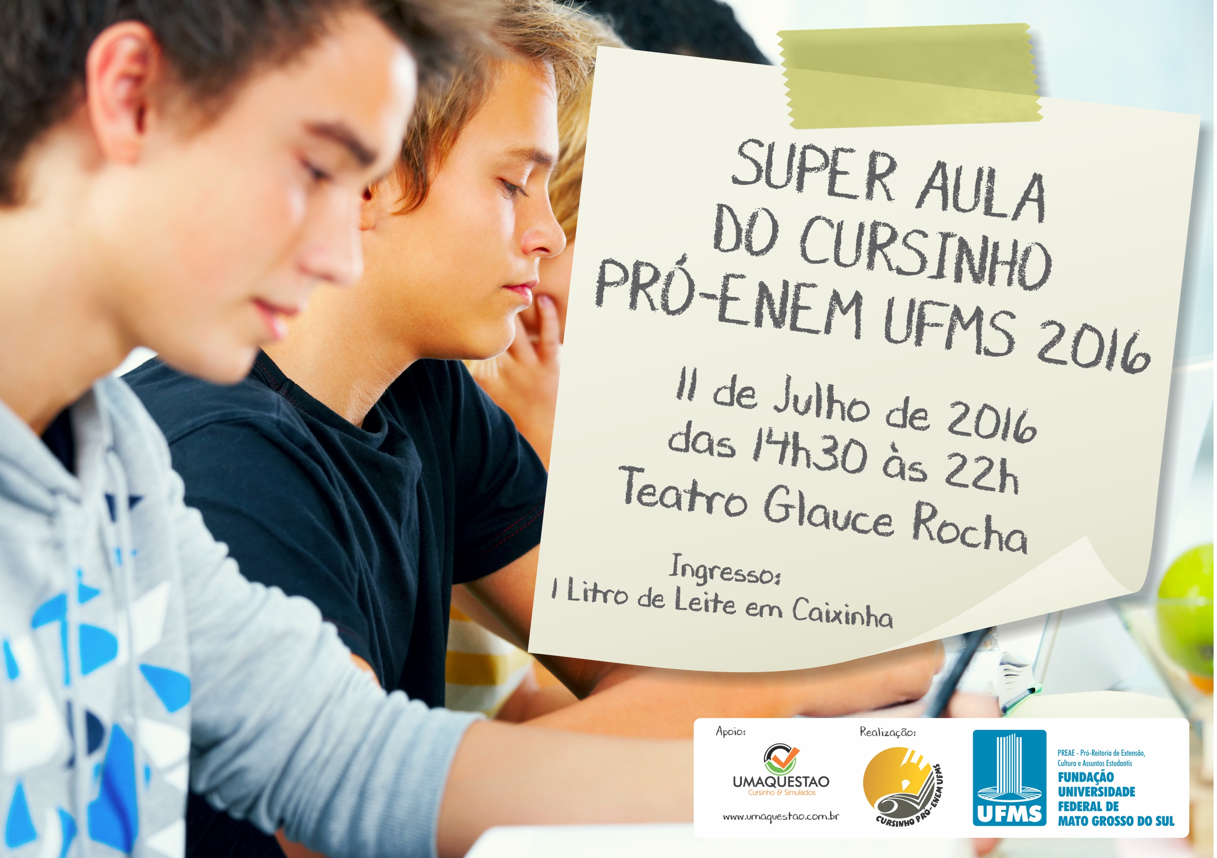 O Cursinho Pró-Enem UFMS realiza no dia 11 de julho a I Super-Aula de 2016. O evento, que contará com palestras e aulas especiais voltadas a quem se prepara para o Enem, começa às 14h30 e vai até as 22h no Teatro Glauce Rocha. A entrada será um 1 litro de leite em caixa, que deve ser entregue no dia do evento.