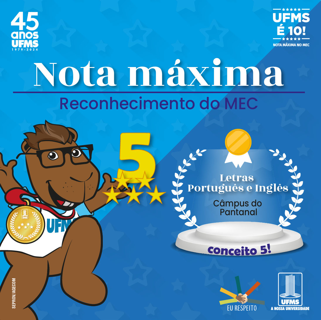 O Curso de Licenciatura em Letras – Português e Inglês do Câmpus do Pantanal (CPan) passa a integrar a lista de cursos de graduação da UFMS que receberam nota máxima na avaliação realizada pelo Ministério da Educação. Para a atribuição do conceito cinco, foram levados em consideração critérios como a organização didático-pedagógica dos cursos, o corpo docente e a infraestrutura, a partir de visitas feitas por avaliadores.