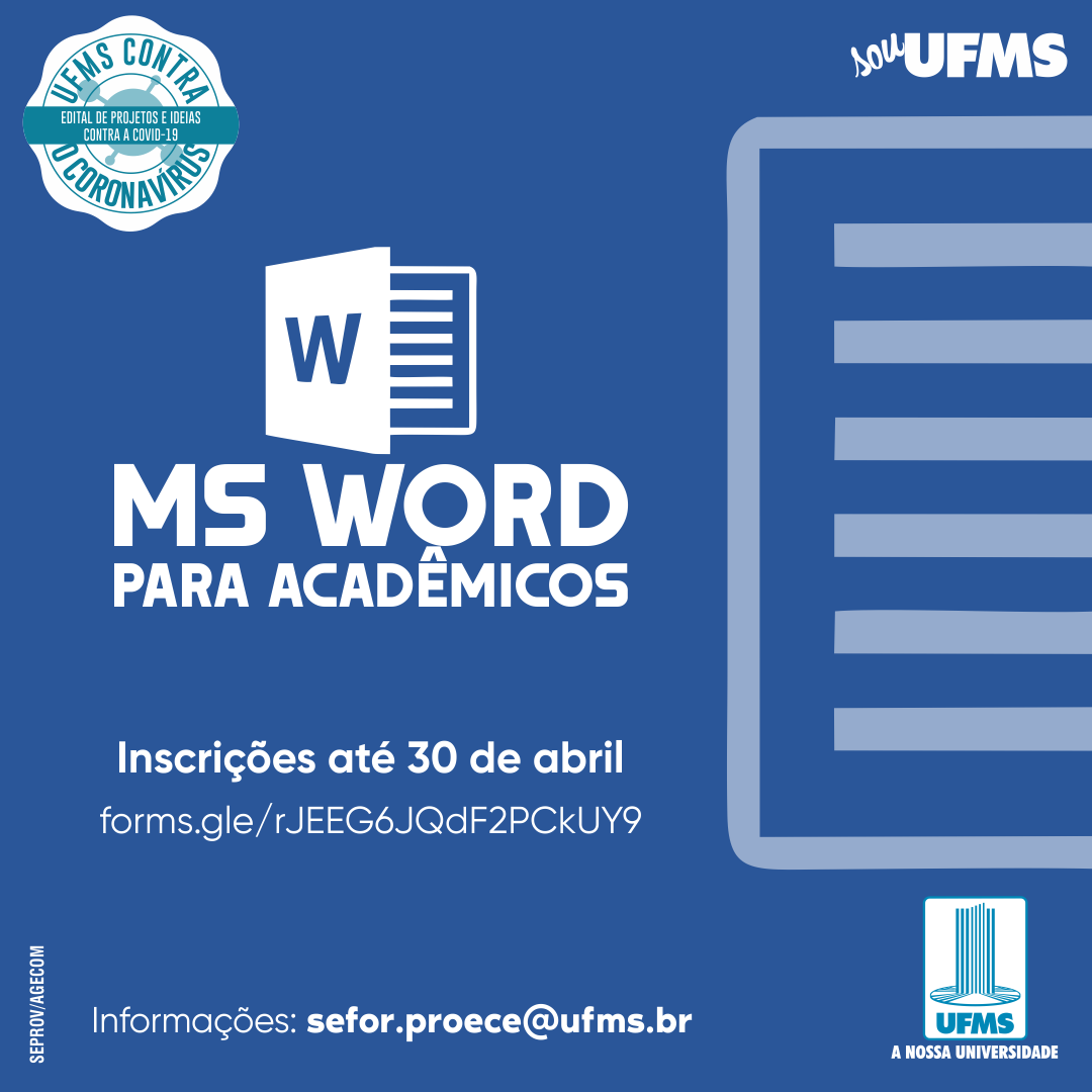 De 1º a 30 de abril estarão abertas as inscrições para o curso MS Word para Acadêmicos. A iniciativa visa oferecer conhecimento sobre técnicas para formatação de trabalhos e escrita científica. Para se inscrever, o participante deverá responder o formulário. O curso é gratuito e será ofertado no Ambiente Virtual de Aprendizagem da UFMS, a partir do dia 3 de maio deste ano.