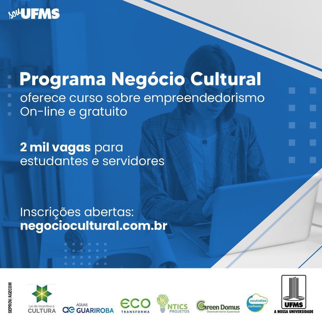 Estudantes e servidores têm a oportunidade de participar de um curso gratuito sobre empreendedorismo. Ao todo, são 2 mil vagas disponíveis para todos os Câmpus, por meio de uma parceria com o programa Negócio Cultural. As aulas são on-line e o objetivo da colaboração é incentivar novos negócios.