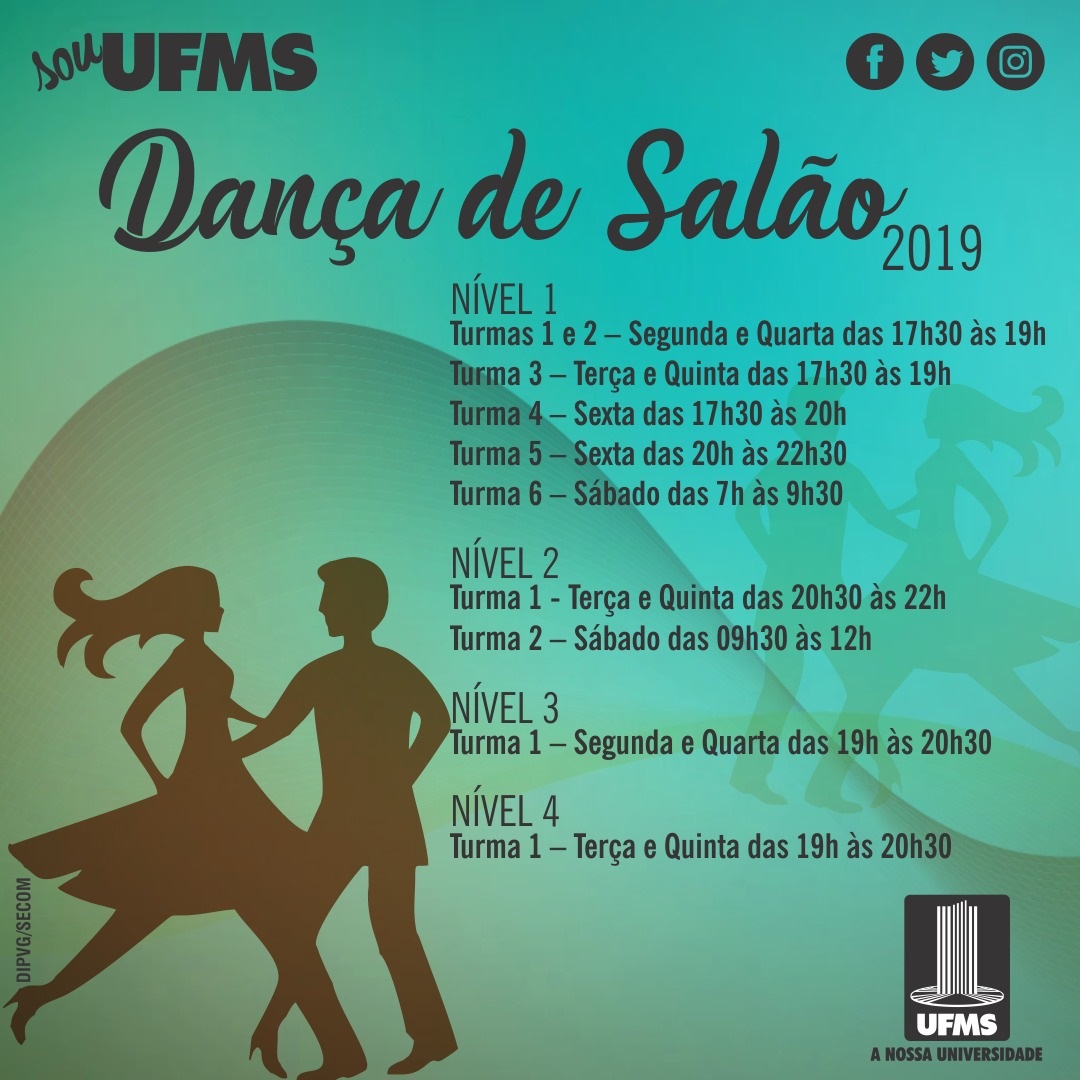 Para os inscritos nos níveis dois, três ou quatro, basta que o candidato tenha sido aprovado no nível anterior ao que deseja cursar. O Projeto de extensão de Dança de Salão da UFMS tem como objetivo promover a dança e a cultura na Universidade.