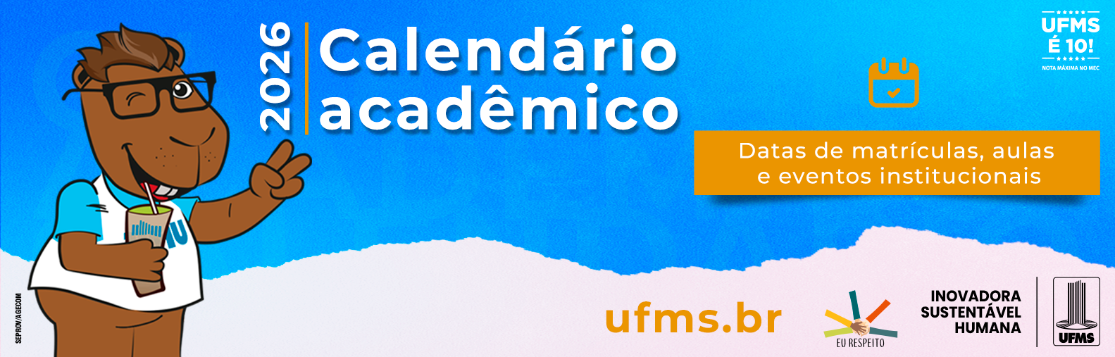 No documento, é possível também conferir as datas de eventos institucionais, como o Festival Mais Esporte, Volta UFMS e Caminhada nos Câmpus, previstos para 24 a 30 de agosto; a Semana de Desenvolvimento Profissional, prevista entre os dias 4 e 8 de maio; o Festival Mais Cultura, que será realizado de 21 a 25 de setembro; e o Integra UFMS 2026, que deve ocorrer entre 19 e 23 de outubro, juntamente com a Feira de Profissões em todos os municípios que a Universidade está presente e em Dourados.