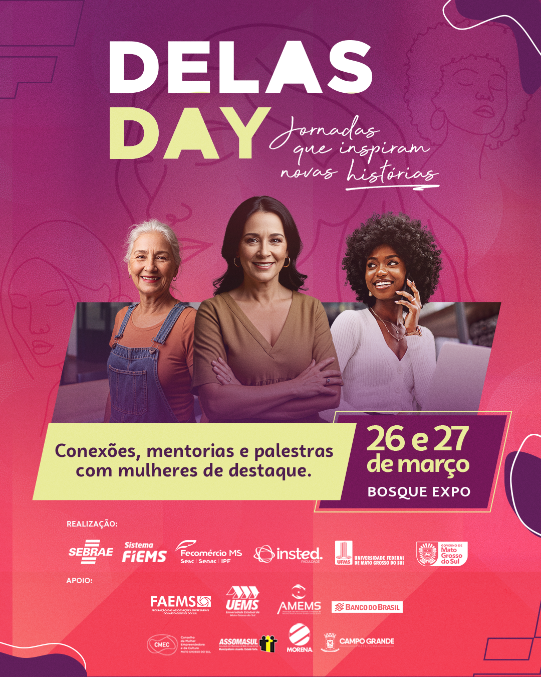 Para incentivar e ampliar o protagonismo feminino, a UFMS apoia e estará presente no Delas Day, nos dias 26 e 27 de março, das 13h às 21h, no Bosque Expo, em Campo Grande. A iniciativa é promovida pelo Sebrae, com apoio do Governo do Estado de Mato Grosso do Sul, da Federação das Indústrias do Estado de Mato Grosso do Sul, da Federação do Comércio de Bens, Serviços e Turismo do Estado de Mato Grosso do Sul e da Faculdade Insted.