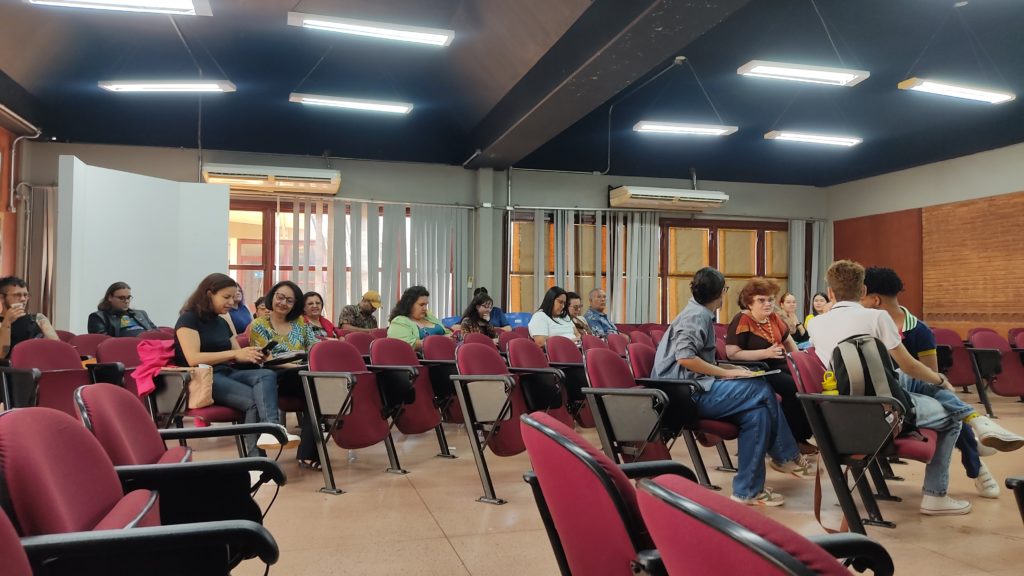 Ainda durante a manhã, o artista Lucas Finonho participou de uma roda de conversa no auditório Arq. Jurandir S. Nogueira, localizado no setor 1 da Cidade Universitária. Nascido em Duque de Caxias (RJ) e licenciado em Artes Visuais pela Universidade Estadual do Rio de Janeiro, ele foi convidado para compartilhar sua trajetória com os estudantes da UFMS. “Minha base artística sempre foi o teatro. Trabalhei com iluminação, cenário, palco, design e fotografia. Também já atuei no carnaval, em barracão de escola de samba, o que me trouxe uma bagagem sobre materiais e pressões do processo criativo”, contou.