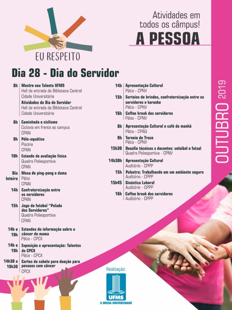 A campanha Eu Respeito de outubro tem como objetivo celebrar as pessoas que compõem a Universidade e é também em outubro, no dia 28, é comemorado o Dia do Servidor Público. Para valorizar estes profissionais tão essenciais para o bom funcionamento da instituição, diversas atividades serão realizadas ao longo da segunda-feira.