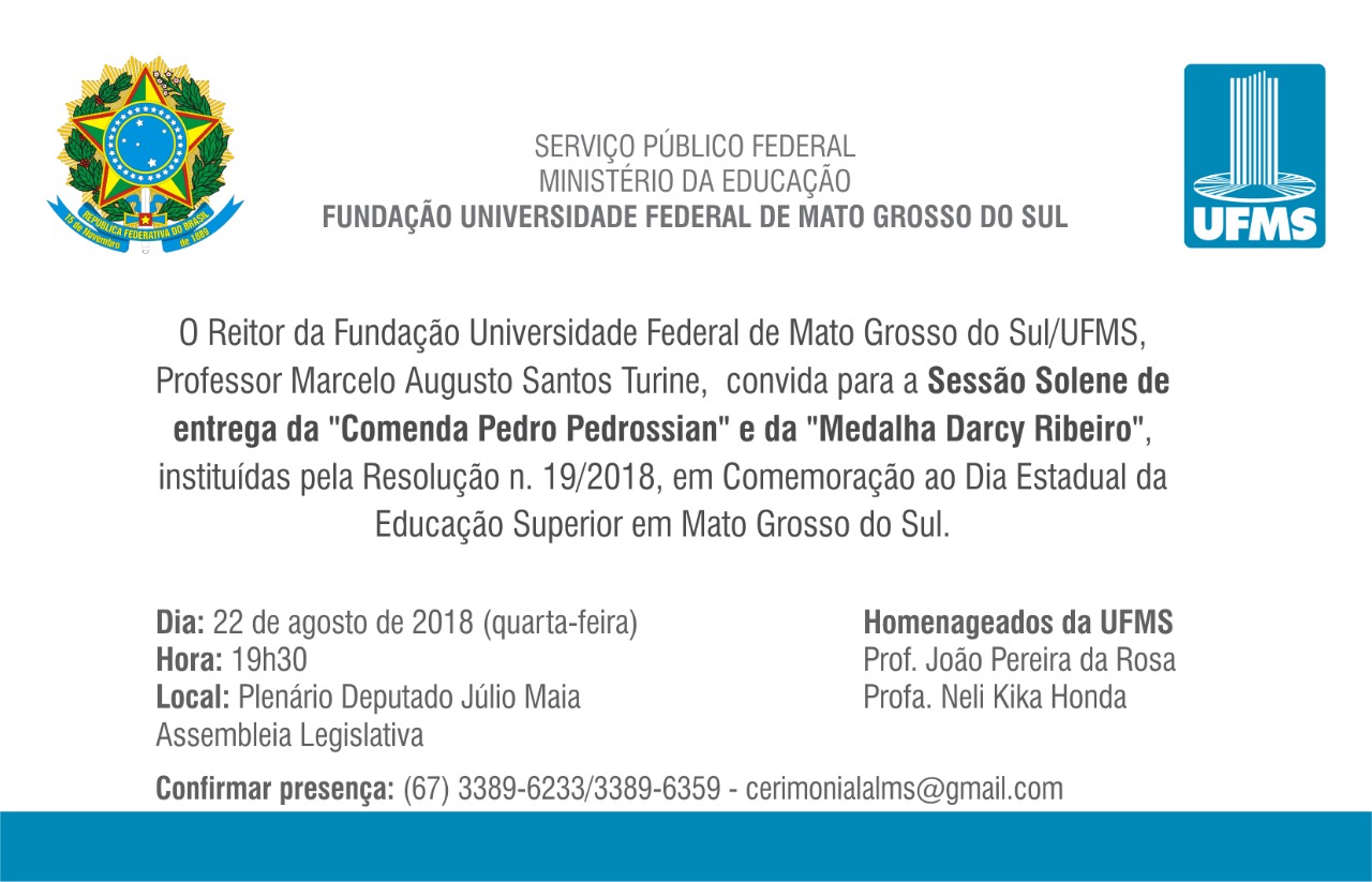 Como indicação da UFMS serão homenageados para receber a comenda, o primeiro reitor da Universidade, professor João Pereira da Rosa, e para receber a medalha a professora Neli Kika Honda.