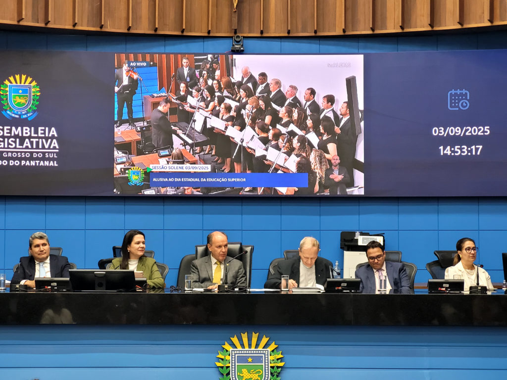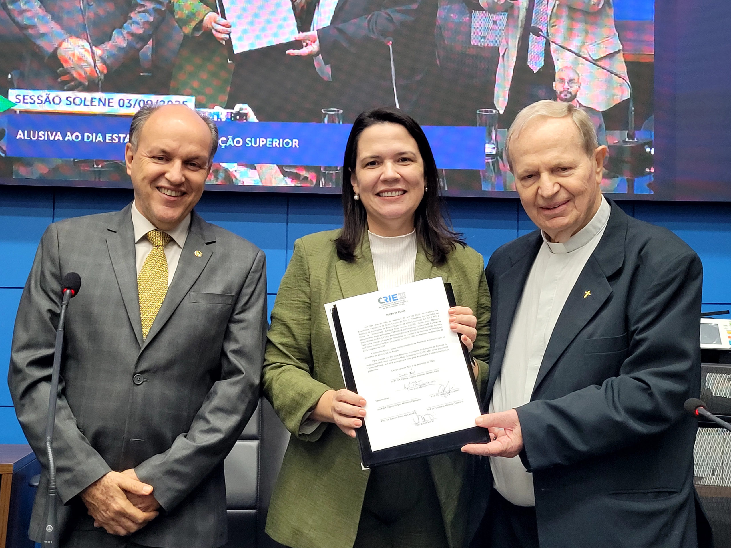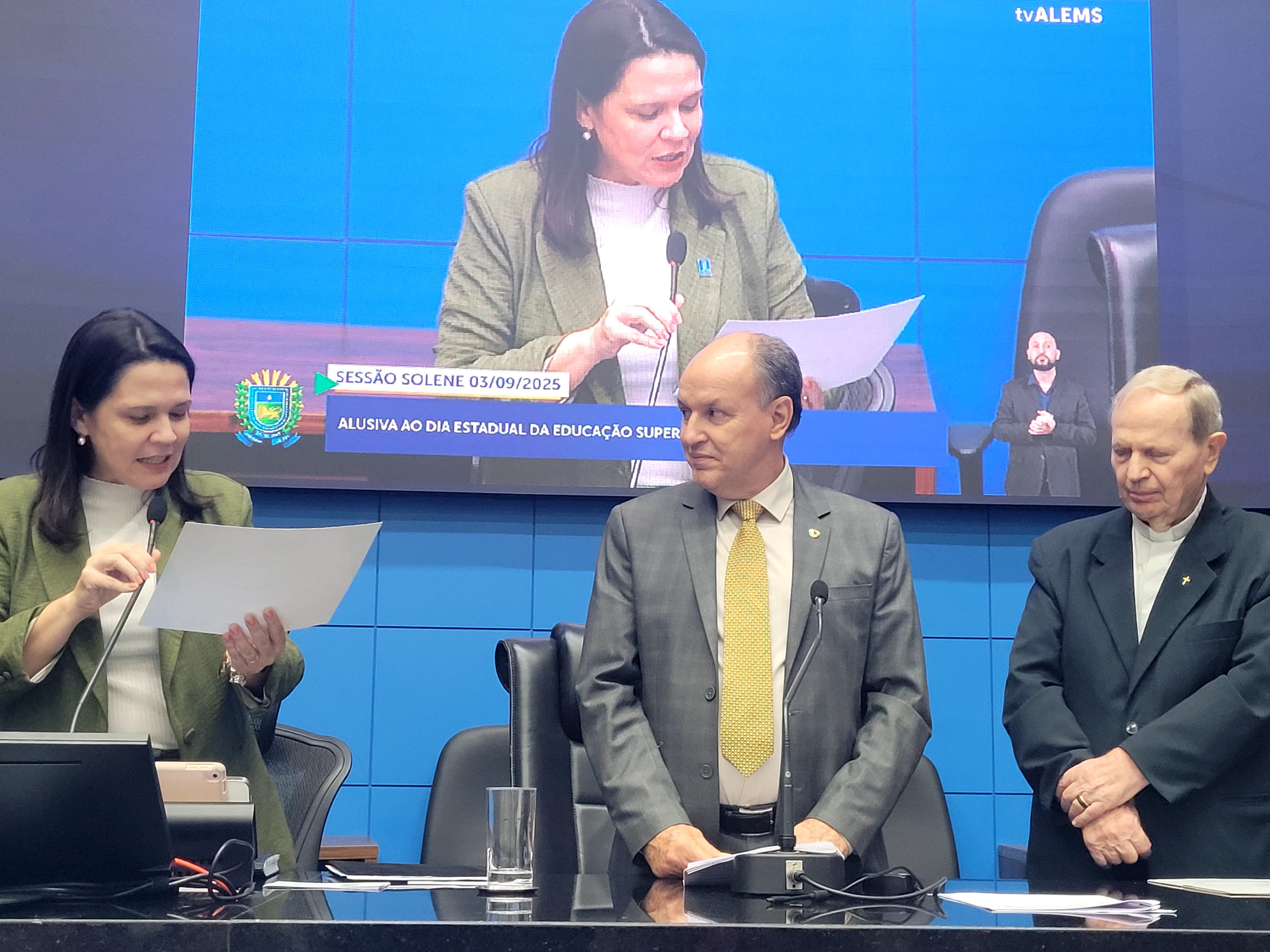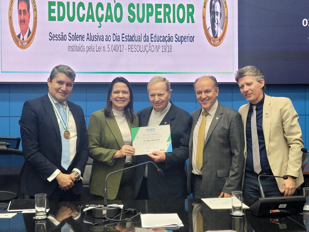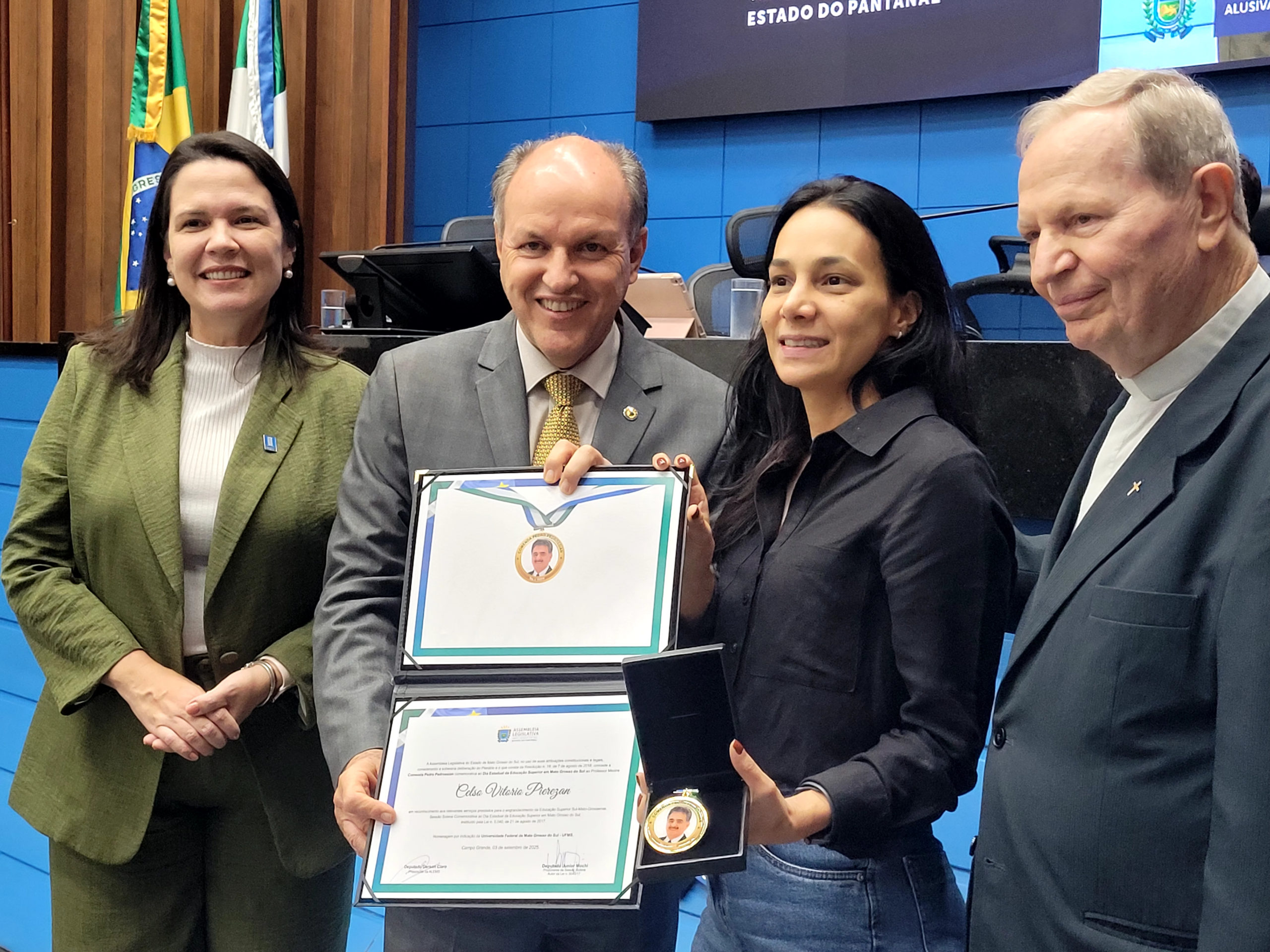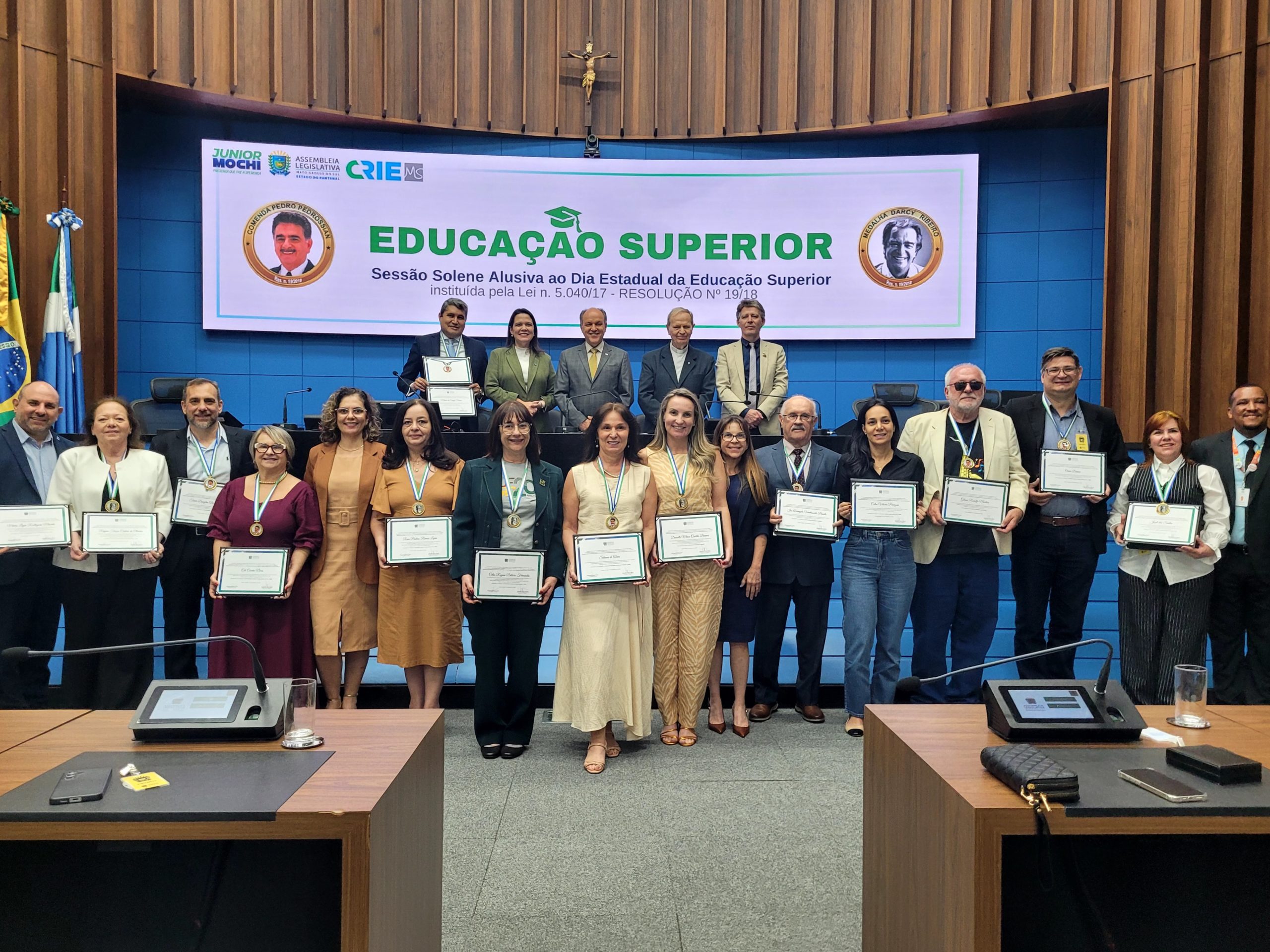 Como forma de homenagear a todos que contribuíram e contribuem para a educação superior em Mato Grosso do Sul, foram entregues na tarde desta quarta-feira, 3, a Medalha Darcy Ribeiro para a professora Maria Ligia Rodrigues Macedo e a Comenda Pedro Pedrossian para os professores Gilson Rodolfo Martins e Celso Vitorio Pierezan, homenageados pela Assembleia Legislativa de Mato Grosso do Sul (Alems). Durante a sessão solene realizada no Plenário Deputado Júlio Maia – Palácio Guaicurus, a reitora Camila Ítavo e a reitora do Instituto Federal de Mato Grosso do Sul (IFMS), Elaine Cassiano, assumiram a gestão do Conselho de Reitores das Instituições de Ensino Superior de Mato Grosso do Sul (Crie-MS). Pela primeira vez na história, a presidência e a vice-presidência são ocupadas por mulheres.