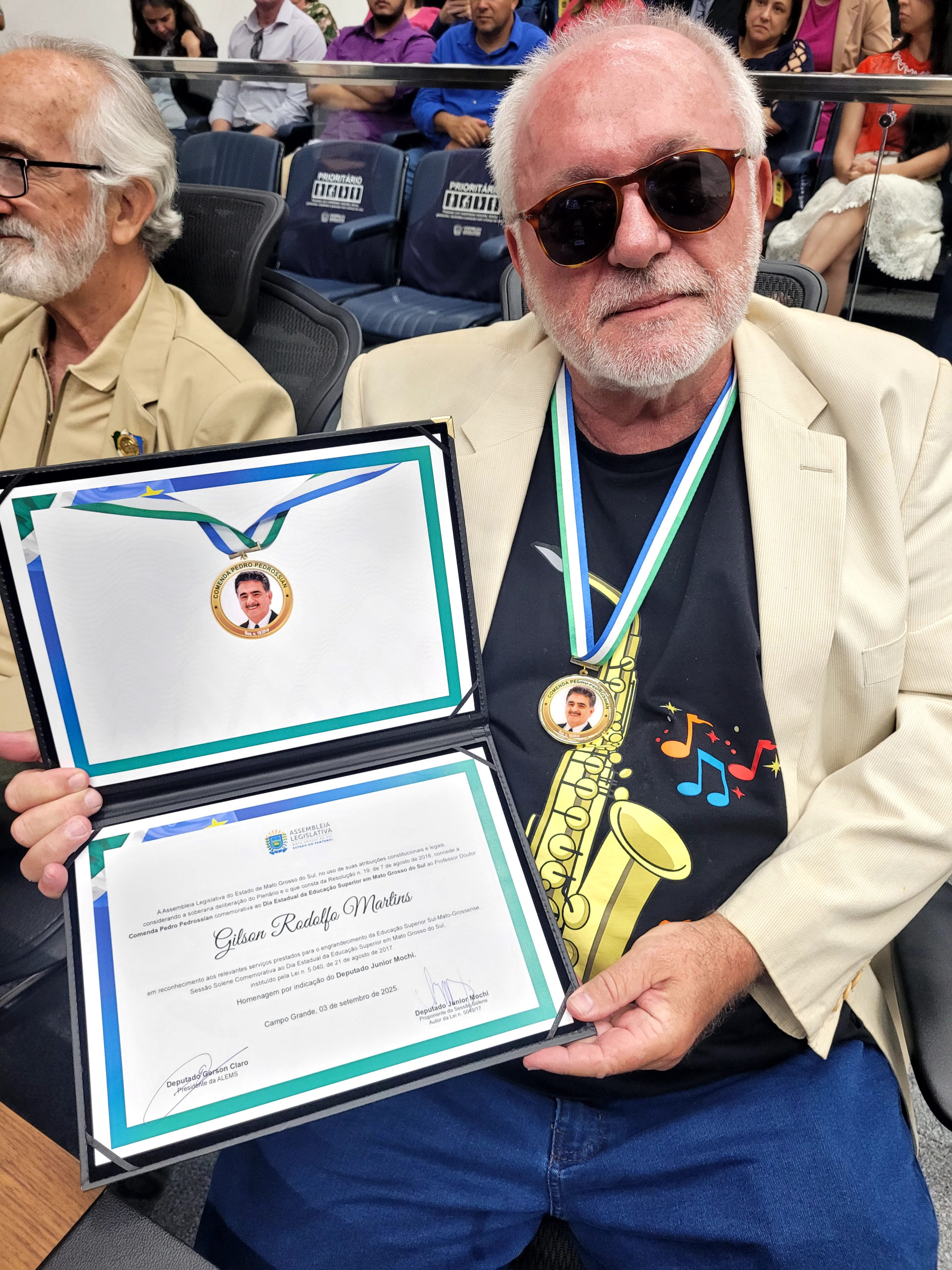 Entre os homenageados da UFMS desta tarde estava o professor aposentado e diretor do Museu de Arqueologia (Muarq) da UFMS de 2006 a 2013, Gilson Rodolfo Martins. “Eu dividi meu período na UFMS basicamente em duas fases, uma fase de professor mesmo e a outra fase como pesquisador. Da metade da minha carreira em diante até eu me aposentar, eu me dediquei 70, 80% para a pesquisa arqueológica aqui em Mato Grosso do Sul, mas, de qualquer forma, um professor, mesmo que seja voltado mais para a pesquisa, não pode deixar de frequentar a sala de aula. Tem que dar aula. Eu multiplico esses 35 anos por cada turma. Cada 40 alunos novos, dá mais de mil professores que hoje atuam ou não nas escolas públicas e particulares de Mato Grosso do Sul e eu me orgulho muito com essa medalha simbólica. Naturalmente que ela simboliza um período de dedicação ao ensino e à pesquisa”, celebrou.