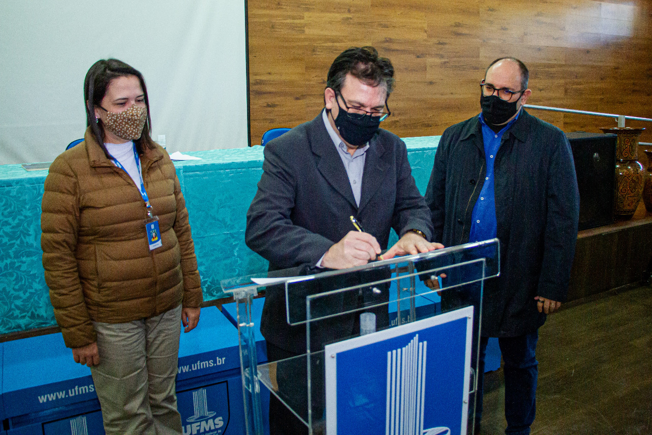O reitor Marcelo Turine e a vice Camila Ítavo reconduziram ao cargo de diretor da Faculdade de Engenharias, Arquitetura e Urbanismo e Geografia (Faeng) o professor Robert Schiaveto de Souza, que assume a posição por mais quatro anos. A solenidade foi realizada na tarde de sexta-feira, 2, no auditório do Complexo EaD e Escola de Extensão.