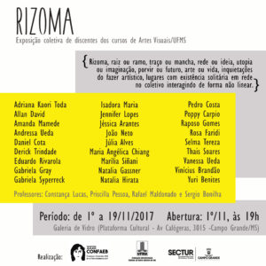 De 1º a 19 de novembro de 2017 será realizada na Galeria de Vidro da Plataforma Cultural a exposição coletiva dos discentes dos cursos de Artes Visuais intitulada “Rizoma”. A abertura será no dia 1º às 19h e a Galeria de Vidro fica na Avenida Calógeras n°3015.