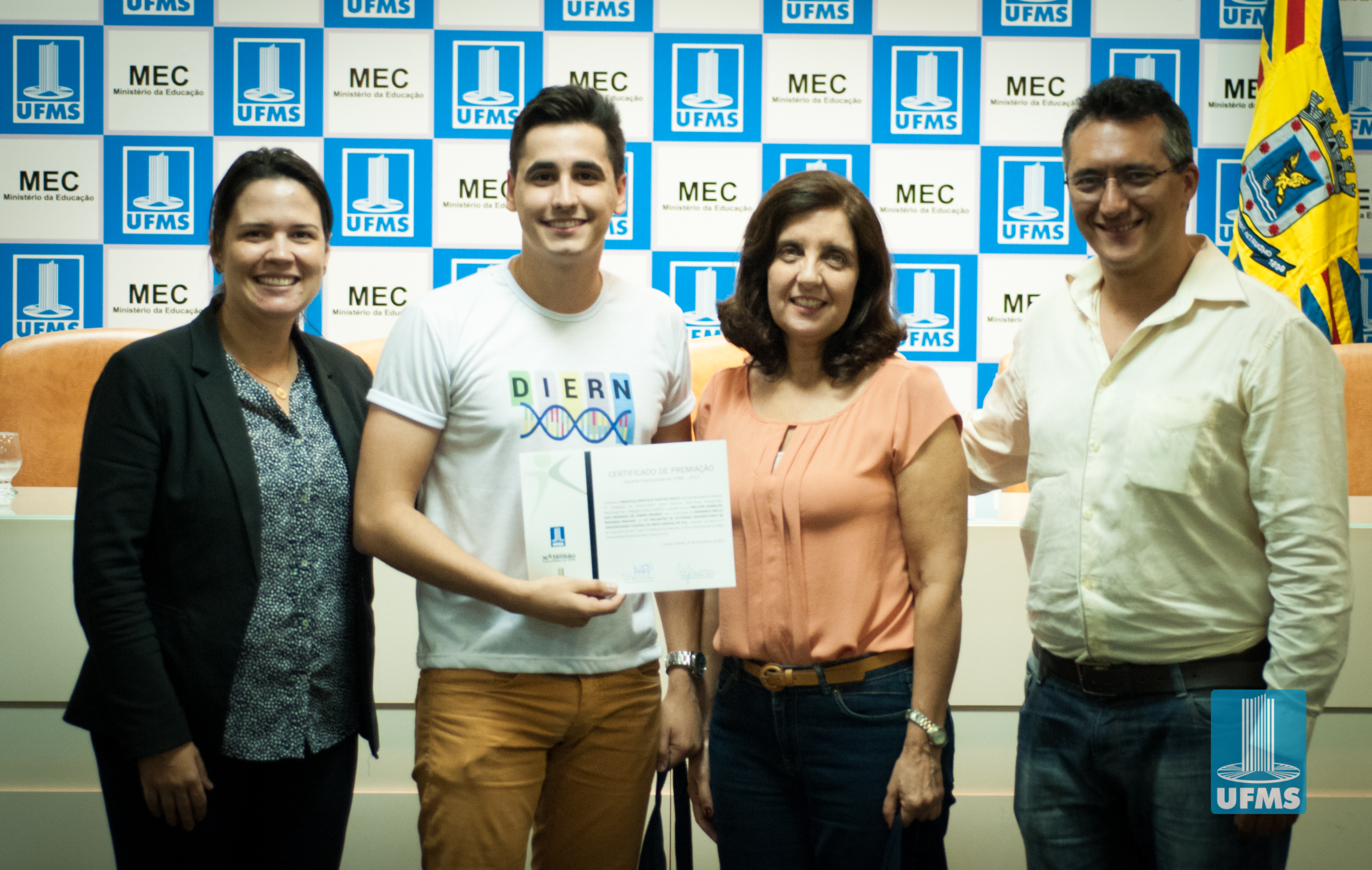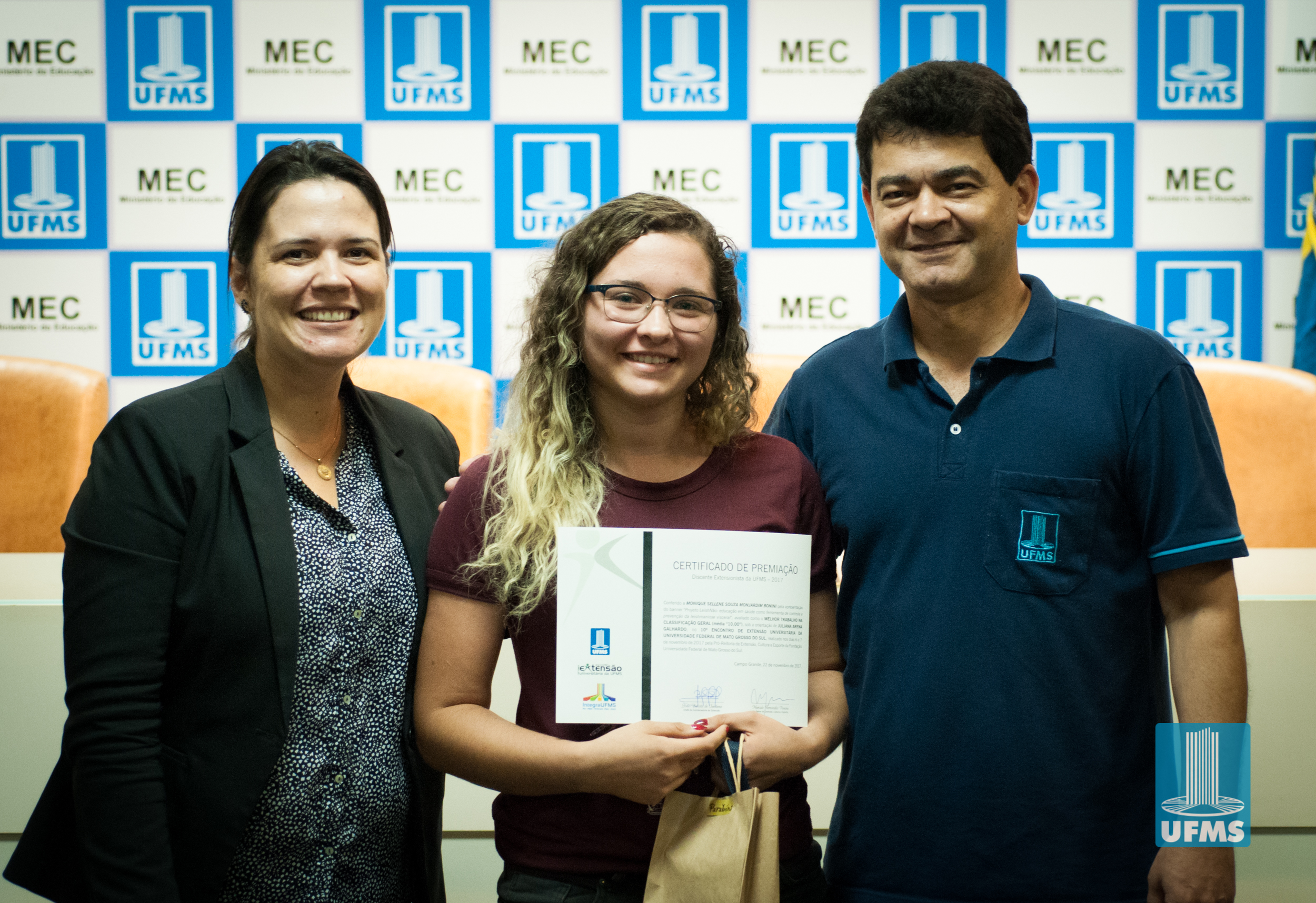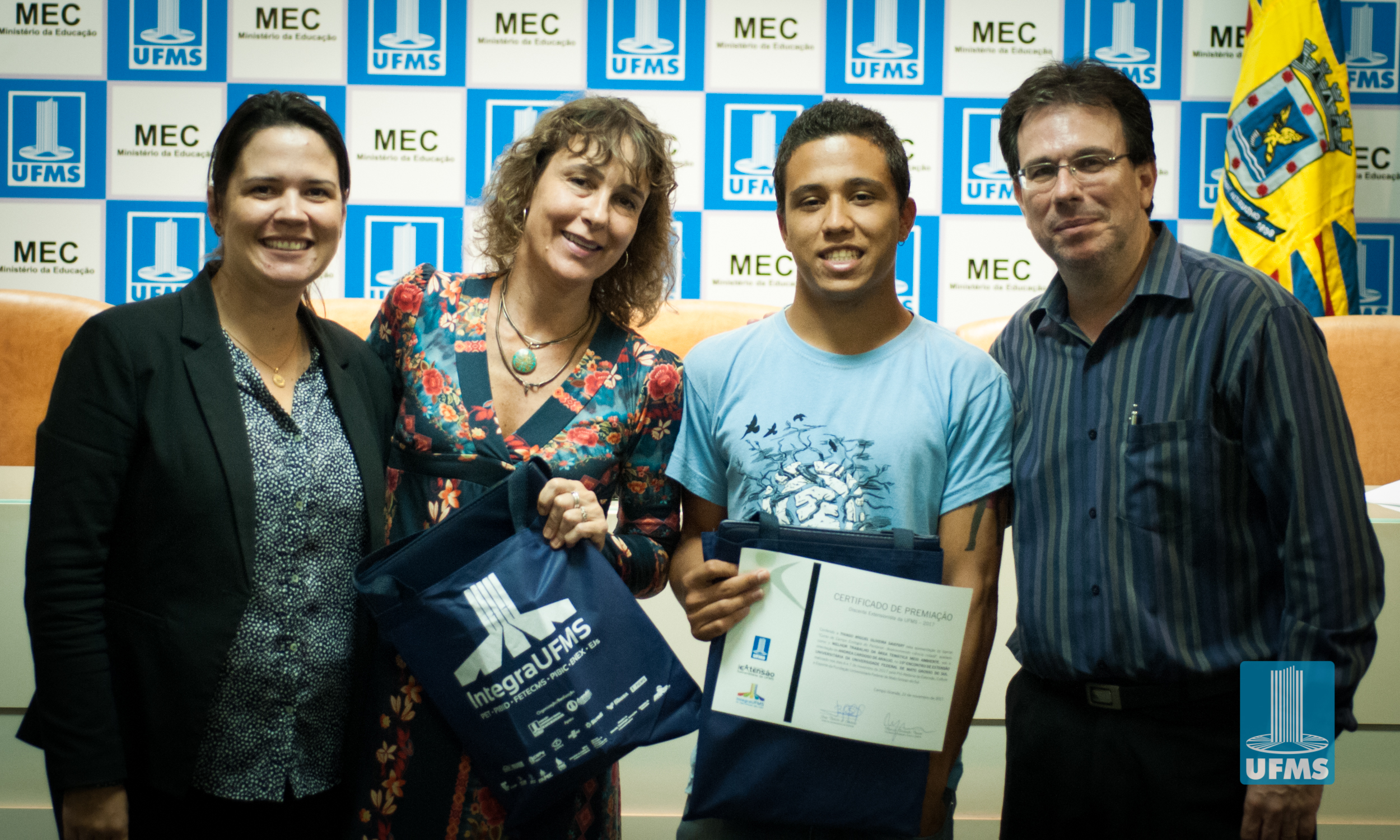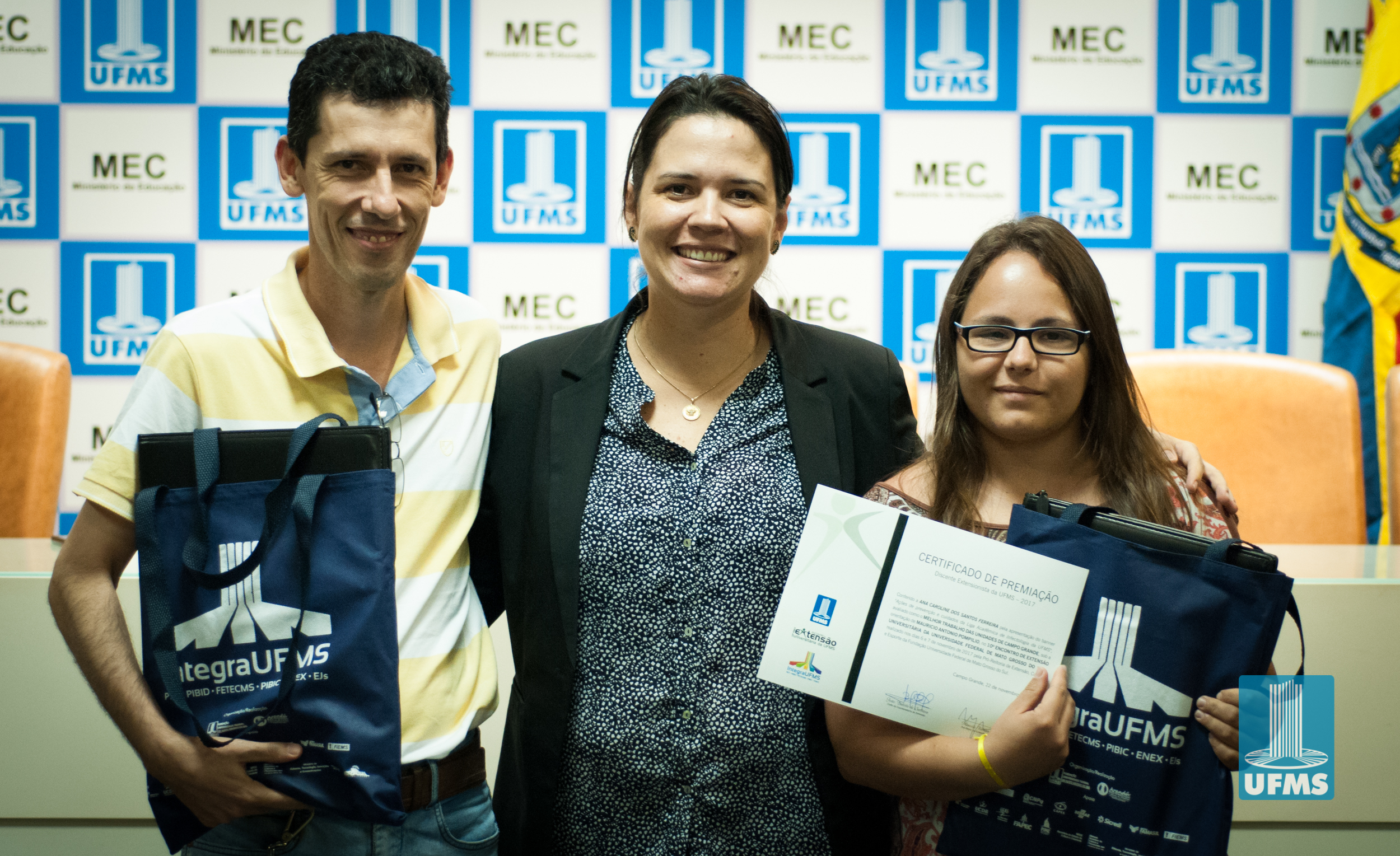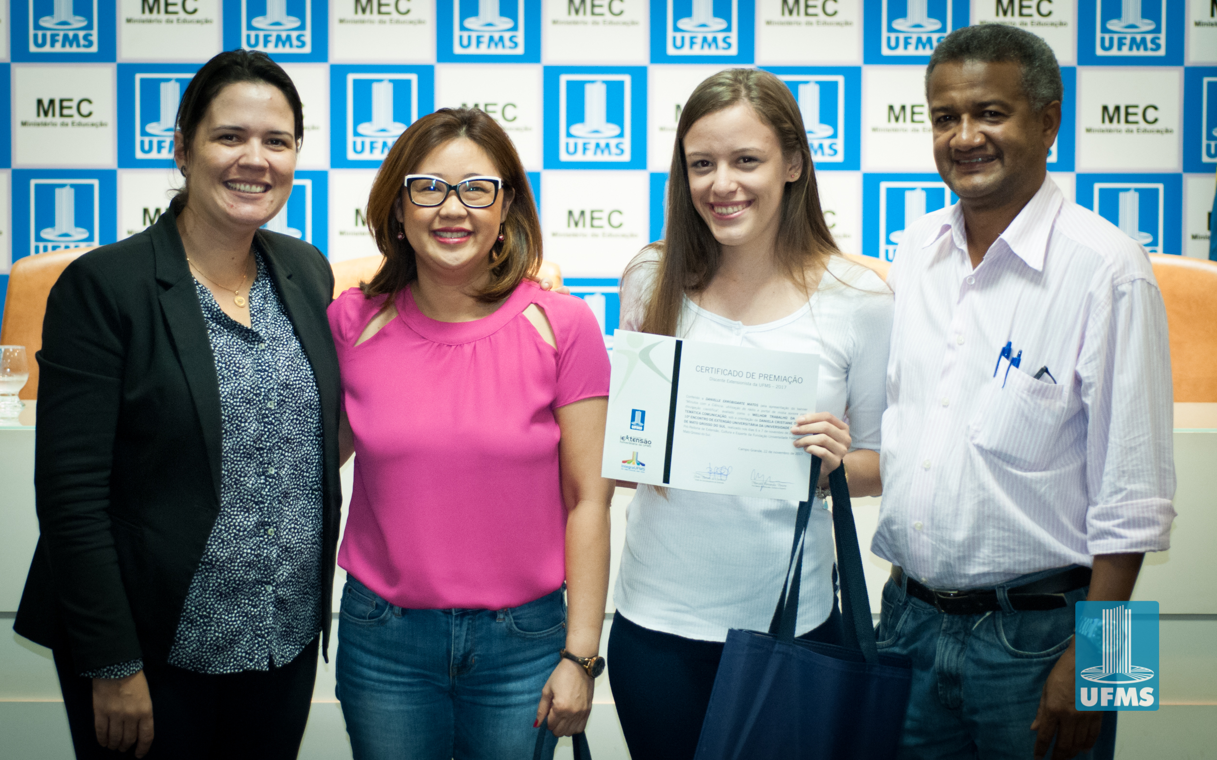 Com o intuito de incentivar o desenvolvimento de ações de extensão universitária, a Pró-Reitoria de Extensão, Cultura e Esporte (PROECE) entregou na tarde de hoje, em cerimônia na Sala de Atos da Reitoria, Certificados do “Prêmio Discente Extensionista da UFMS – 2017” aos discentes responsáveis pelas apresentações daqueles que foram avaliados como os melhores trabalhos na modalidade “Banner”.
