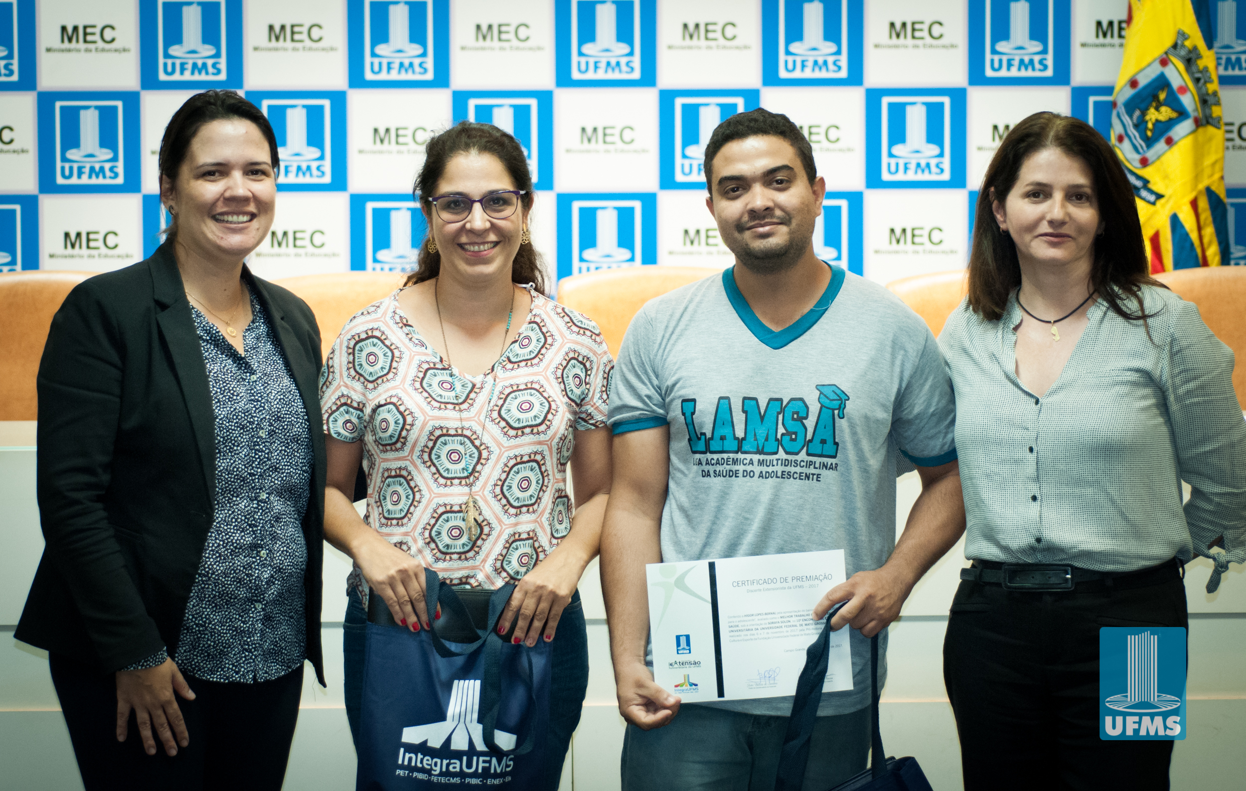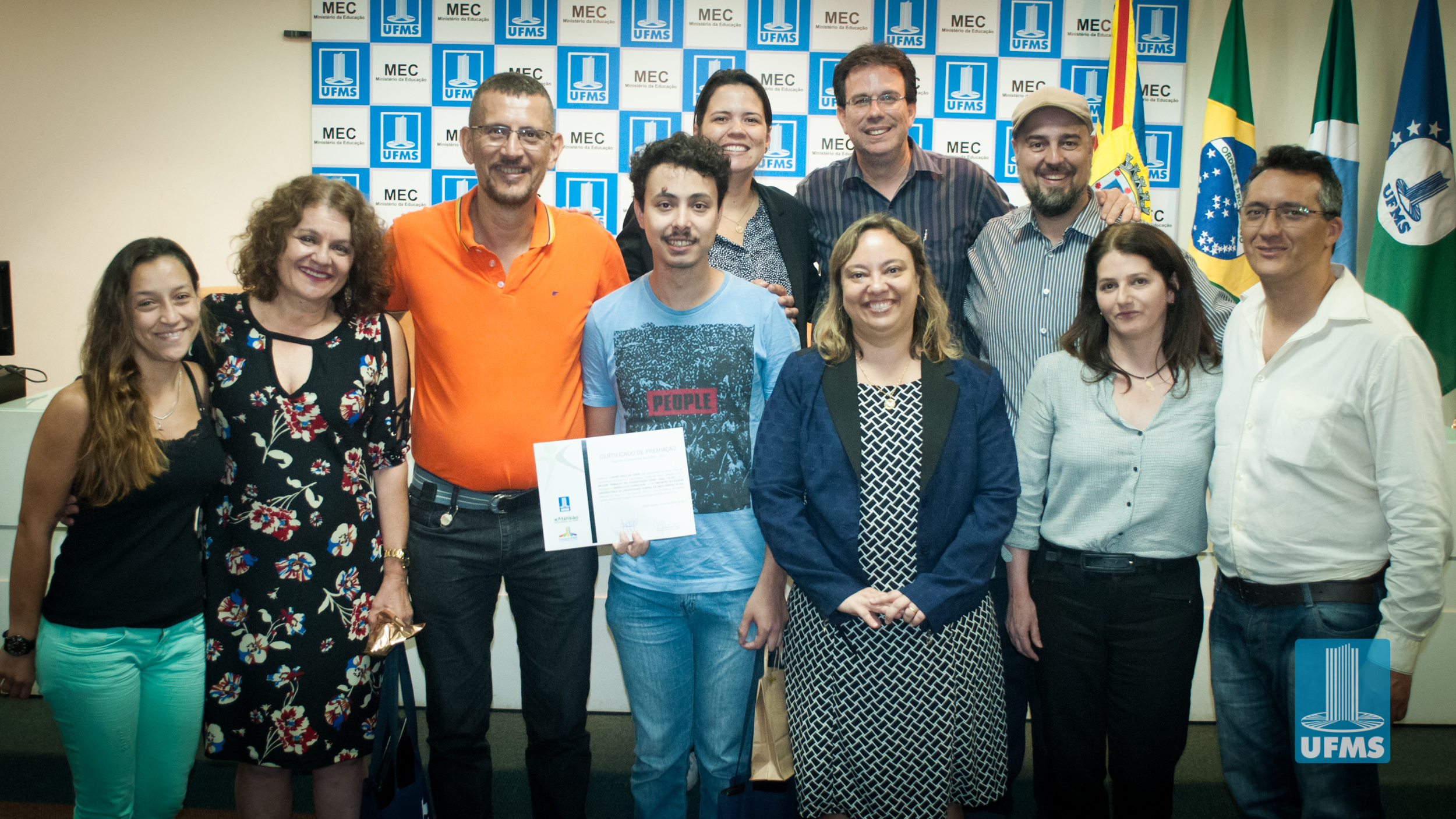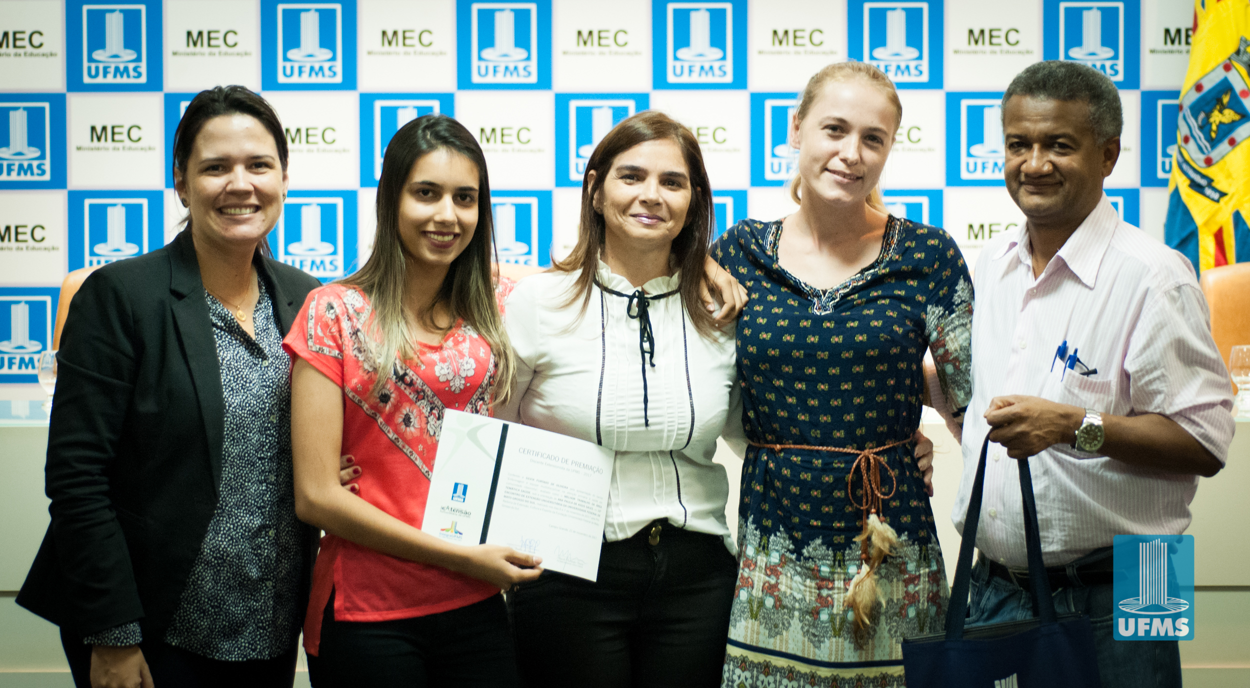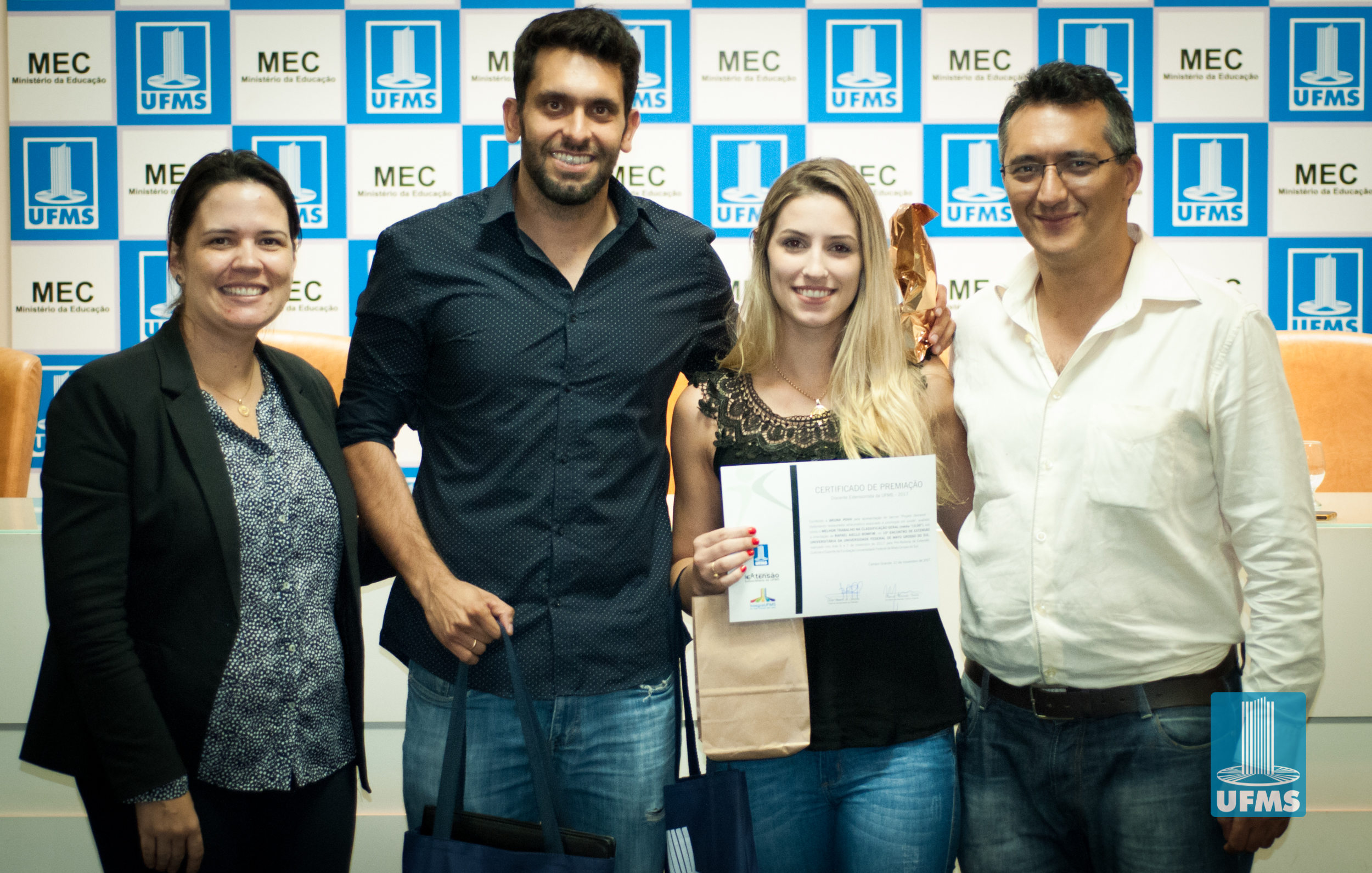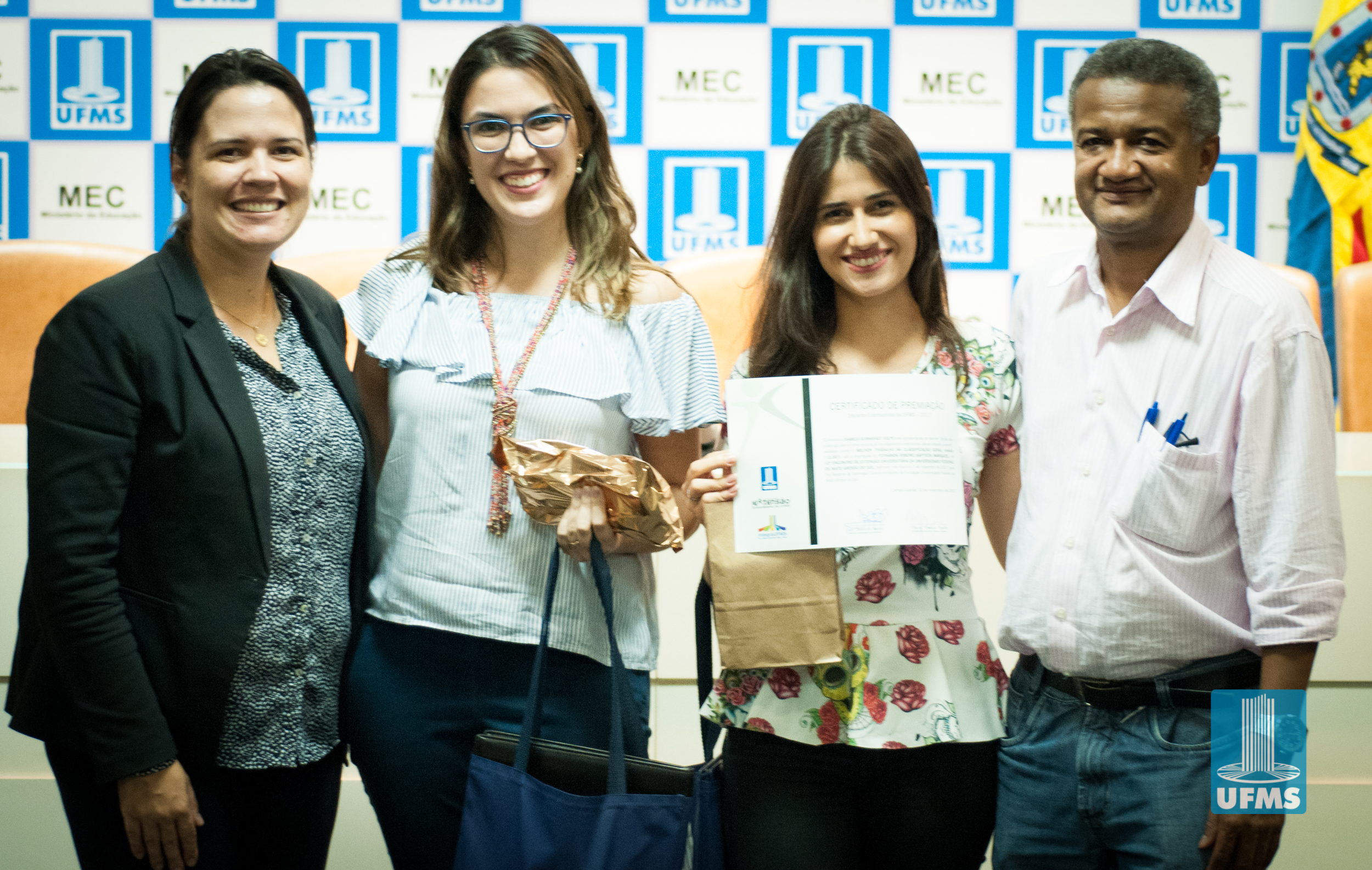 Com o intuito de incentivar o desenvolvimento de ações de extensão universitária, a Pró-Reitoria de Extensão, Cultura e Esporte (PROECE) entregou na tarde de hoje, em cerimônia na Sala de Atos da Reitoria, Certificados do “Prêmio Discente Extensionista da UFMS – 2017” aos discentes responsáveis pelas apresentações daqueles que foram avaliados como os melhores trabalhos na modalidade “Banner”.