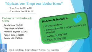 A disciplina optativa “Tópicos em Empreendedorismo” é uma parceria com o Sebrae e está com inscrições abertas para acadêmicos de cursos diversos. As aulas acontecem na sala 11 do Complexo Multiuso, às terças-feiras, das 19 às 21 horas e às quartas-feiras, das 17 às 19 horas, e tem duração de um semestre.