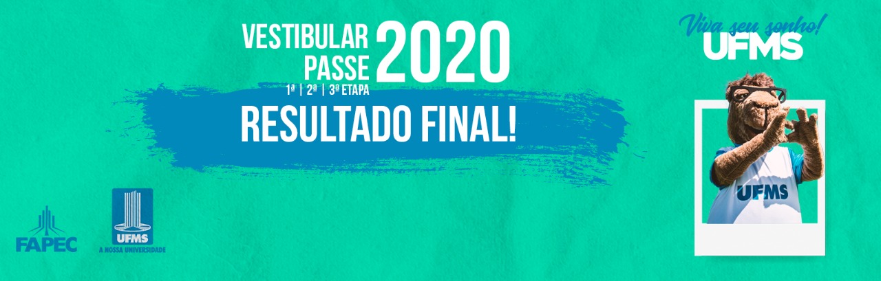 Foram publicados os editais com os resultados finais do Vestibular 2020 e do Programa de Avaliação Seriada Seletiva – Passe 3ª Etapa, destinados à seleção de candidatos para o preenchimento de vagas nos cursos de graduação, na modalidade presencial, para ingresso no ano letivo de 2020 na UFMS.