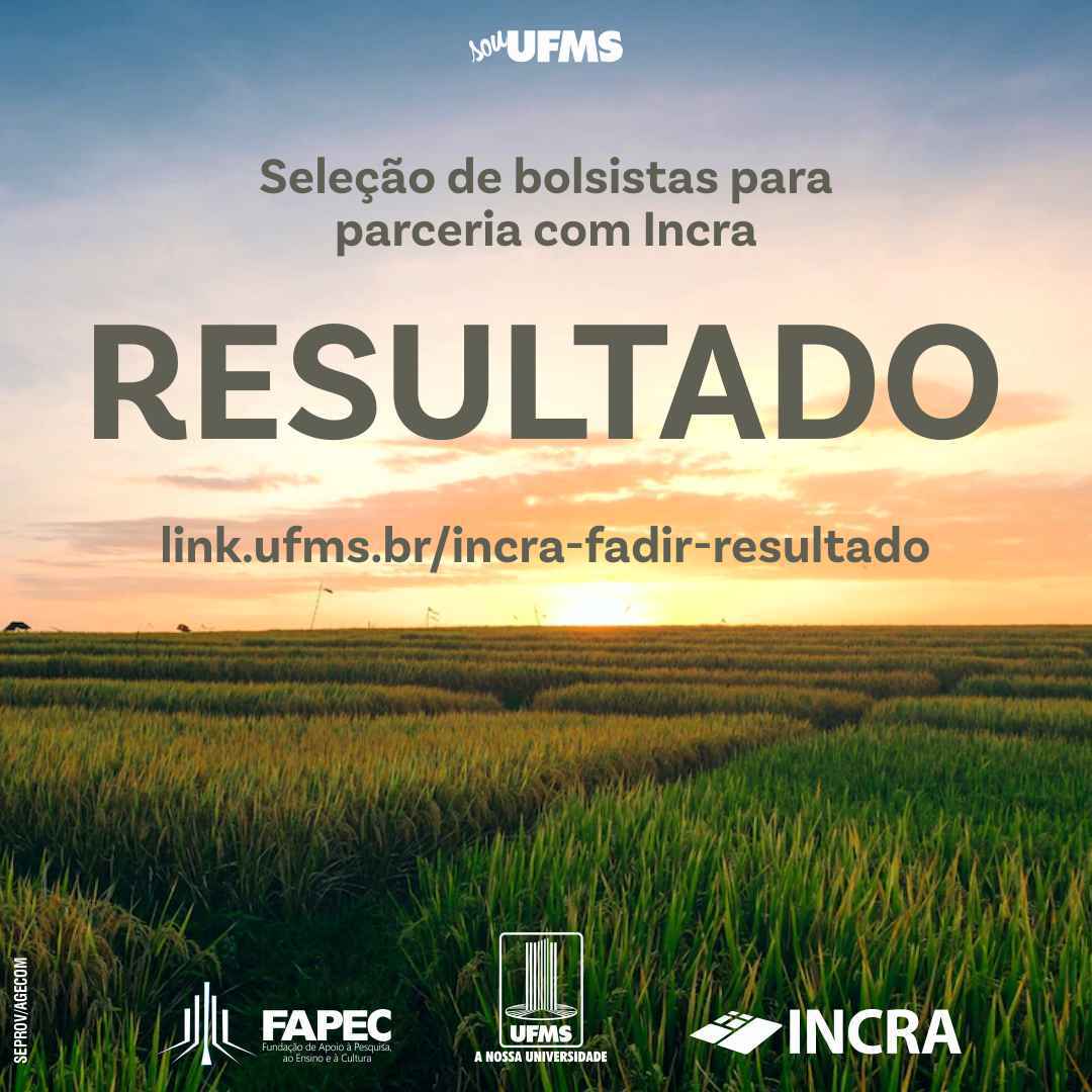 Os estudantes que se inscreveram no processo seletivo para participar da ação de extensão “Desenvolvimento de processos inovadores de supervisão ocupacional com o ímpeto de promover ações necessárias à titulação em projetos de assentamento federais do Programa Nacional de Reforma Agrária e de Regularização Fundiária no Estado do Mato Grosso do Sul”,  já podem conferir o resultado, clicando aqui.