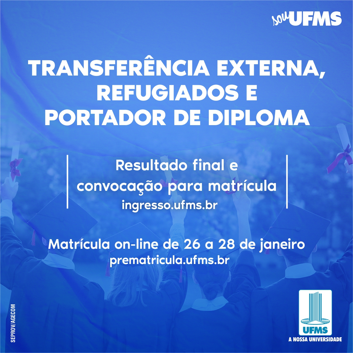 Participantes do processo seletivo para ingresso na UFMS por transferência externa, refugiados e portadores de diploma já podem acessar no site ingresso.ufms.br o resultado final e a convocação para matrícula. Os selecionados terão de 26 a 28 de janeiro para se matricularem on-line no site prematricula.ufms.br.