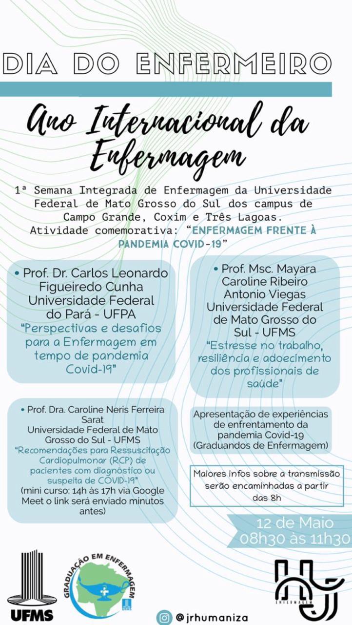 Professores e estudantes dos cursos de Enfermagem da UFMS participam remotamente da 1ª Semana Integrada de Enfermagem. A atividade comemorativa “Enfermagem frente à pandemia Covid-19” é realizada on-line por meio deste link.