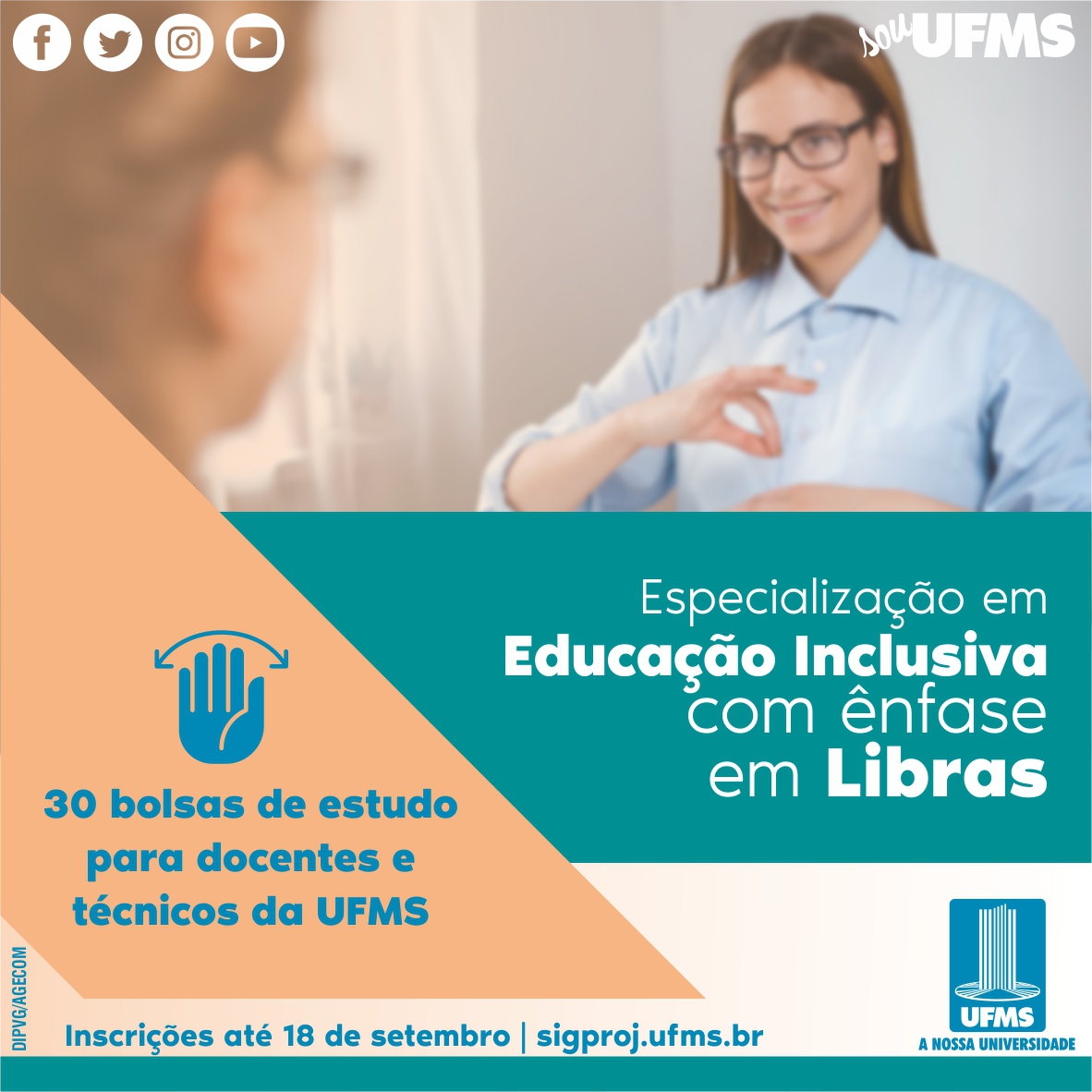Estão abertas as inscrições para professores e técnicos administrativos da UFMS cursarem a Especialização em Educação Inclusiva com ênfase em Libras com bolsa de estudos. Ao todo são 30 oportunidades e os interessados têm até 18 de setembro para se inscreverem no Sigproj.