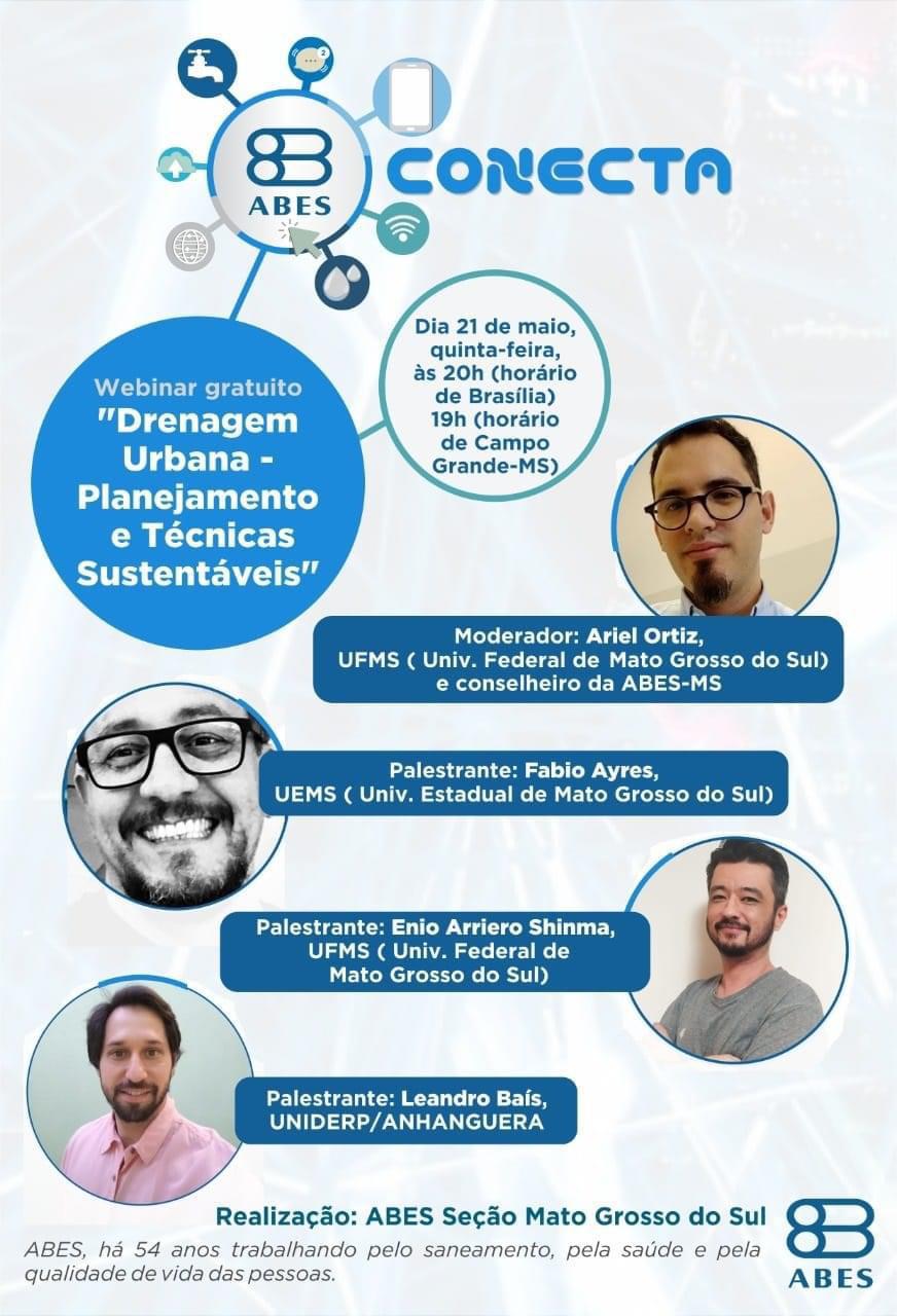 No dia 21 de maio, às 19h, será realizado o webinar “Drenagem urbana – planejamento e técnicas sustentáveis”, organizado pela Associação Brasileira de Engenharia Sanitária e Ambiental (ABES-MS). Serão três palestrantes de diferentes instituições de ensino, especializados em três diferentes áreas do tema.