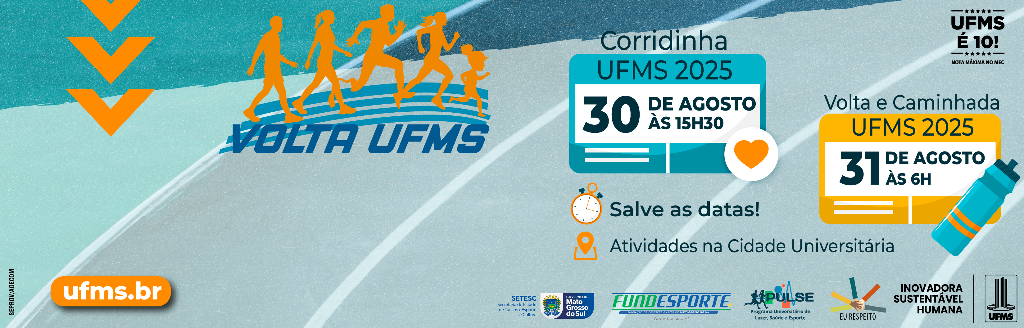 A Volta UFMS e a Caminhada UFMS serão no domingo, 31 de agosto, a partir das 7h. O percurso da caminhada será de três quilômetros e a idade mínima para participar é sete anos de idade completos, devendo, no ato da inscrição, o responsável assinar o Termo de Autorização e de Responsabilidade, caso o participante seja menor de 18 anos. Para as corridas de quatro e de sete quilômetros da Volta UFMS, a idade mínima para participar é 16 anos completos até 31 de dezembro de 2025. A concentração será às 6h.
