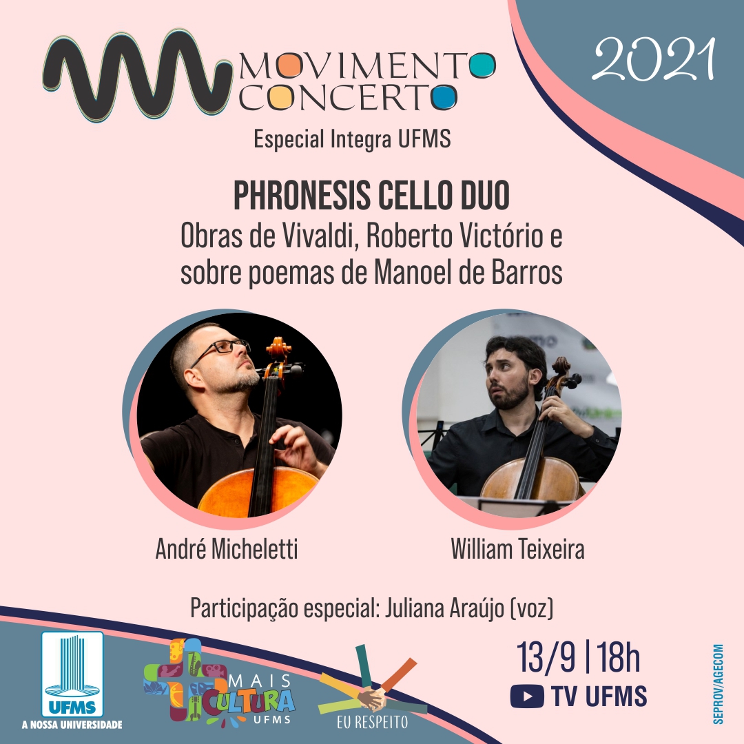 O Movimento Concerto é um programa de extensão da Universidade, existente desde 2007, que realiza apresentações musicais gratuitas com o objetivo de democratizar o acesso a concertos de música erudita e suas fronteiras. Em decorrência da pandemia de Covid-19, a edição especial para o Integra UFMS 2021 foi gravada previamente. Durante a transmissão, os integrantes do Phronesis Cello Duo irão comentar ao vivo sobre o repertório apresentado e o público poderá interagir pelo chat do canal.