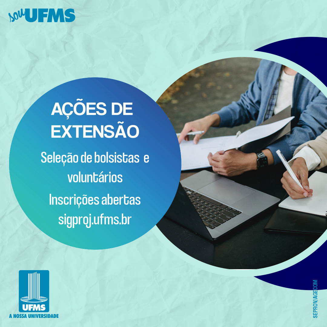 Estão abertas as inscrições de propostas para os programas de bolsistas e voluntários de extensão da UFMS. Os estudantes interessados podem procurar professores extensionistas para elaborarem um plano de trabalho, que deve ser apresentado até o dia 31 de março.