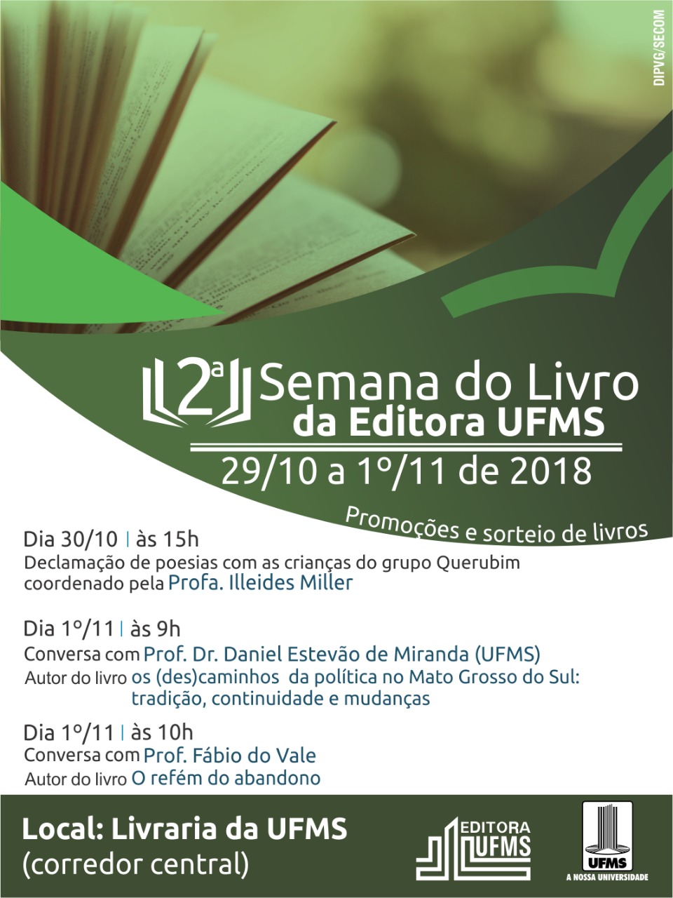 Entre os dias 29 de outubro e 1º de novembro, a Editora UFMS promove a 2ª Semana do Livro, nas dependências da Livraria, localizada no Corredor Central da Cidade Universitária.