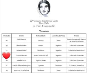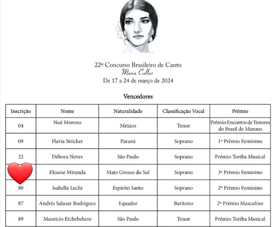 Realizado desde 1993, o Concurso Brasileiro de Canto Maria Callas é considerado um dos mais importantes da América Latina e tem revelado nomes de destaque na cena lírica. Em 2024, chegou à sua 22ª edição e contou com a participação de mais de cem semifinalistas e teve a etapa final realizada em São Paulo e Jacareí, entre os dias 17 e 24 de março. A egressa do curso de Música da UFMS Elouise Miranda conseguiu o terceiro lugar na classificação final e foi um dos destaques do concurso.