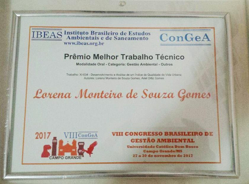 O trabalho premiado na categoria Gestão Ambiental foi o artigo científico intitulado “Desenvolvimento e Análise de um Índice de Qualidade de Vida Urbana”, fruto de seu Trabalho de Conclusão de Curso (TCC), orientado pelo professor Ariel Ortiz Gomes.