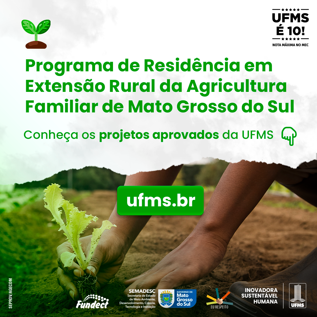 Três propostas da UFMS foram aprovadas no Programa de Residência em Extensão Rural da Agricultura Familiar de Mato Grosso do Sul. Realizado pelo Governo do Estado, por meio da Secretaria Executiva de Agricultura Familiar, de Povos Originários e Comunidades Tradicionais, o programa promove treinamentos práticos e supervisionados para integrar recém-formados em ciências agrárias e afins aos ambientes de trabalho.