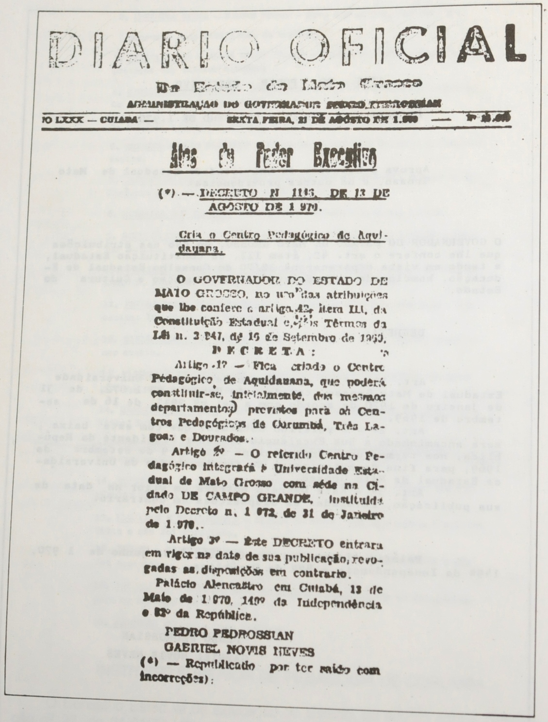 A história do campus de Aquidauana teve início em 1970, a partir de uma solicitação na Câmara dos Vereadores para a criação da Faculdade de Filosofia no município. Em julho do mesmo ano é aceita a criação da instituição de ensino superior pelo governo. Após diversas reuniões com representantes da sociedade aquidauanense para a estruturação do ensino, no dia 21 de agosto é publicado no Diário Oficial do Estado de Mato Grosso, o Decreto nº 1.146, criando o Centro Pedagógico de Aquidauana (CPA), integrado à Universidade Estadual de Mato Grosso (UEMT), com sede na cidade de Campo Grande.
