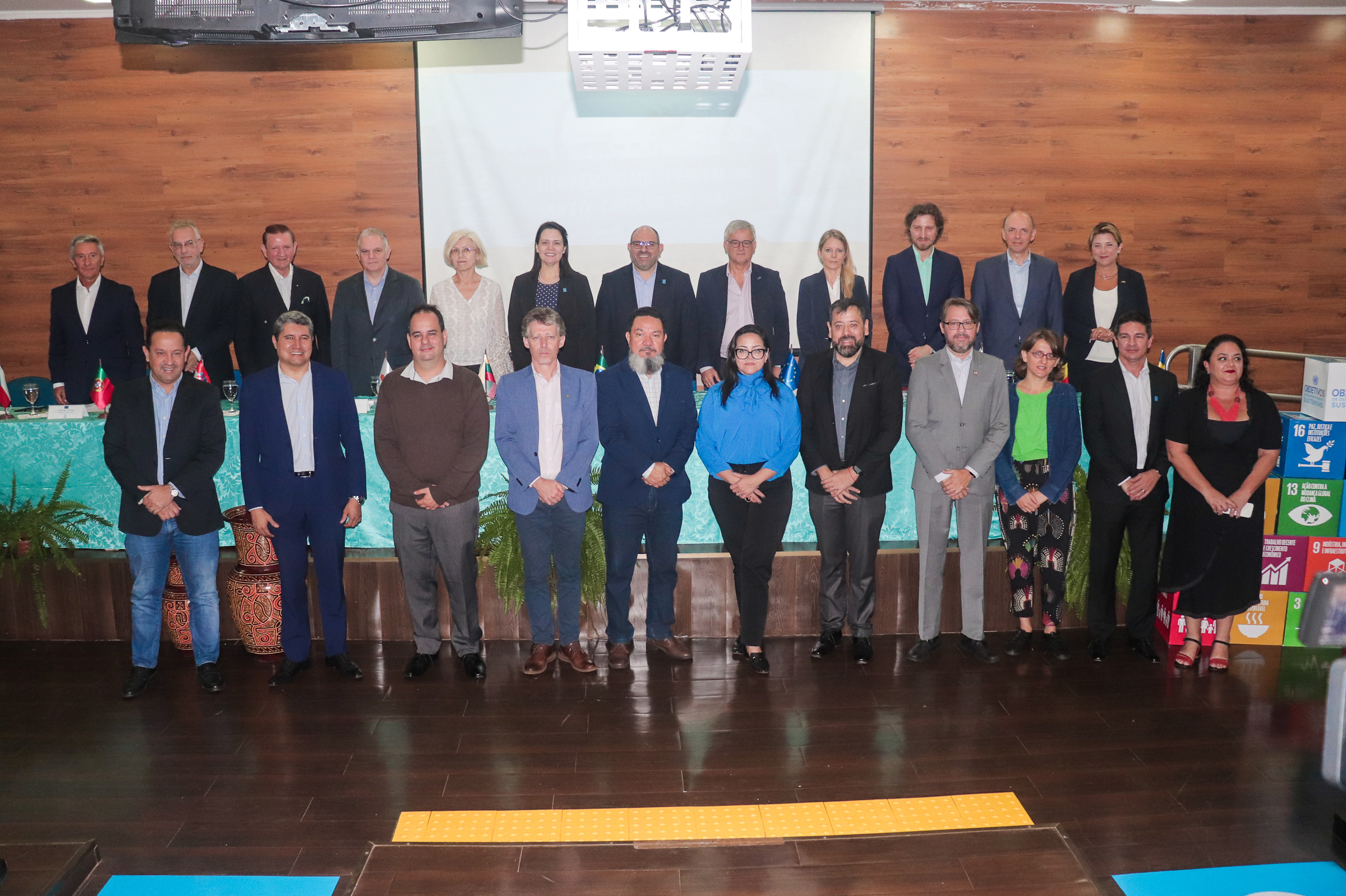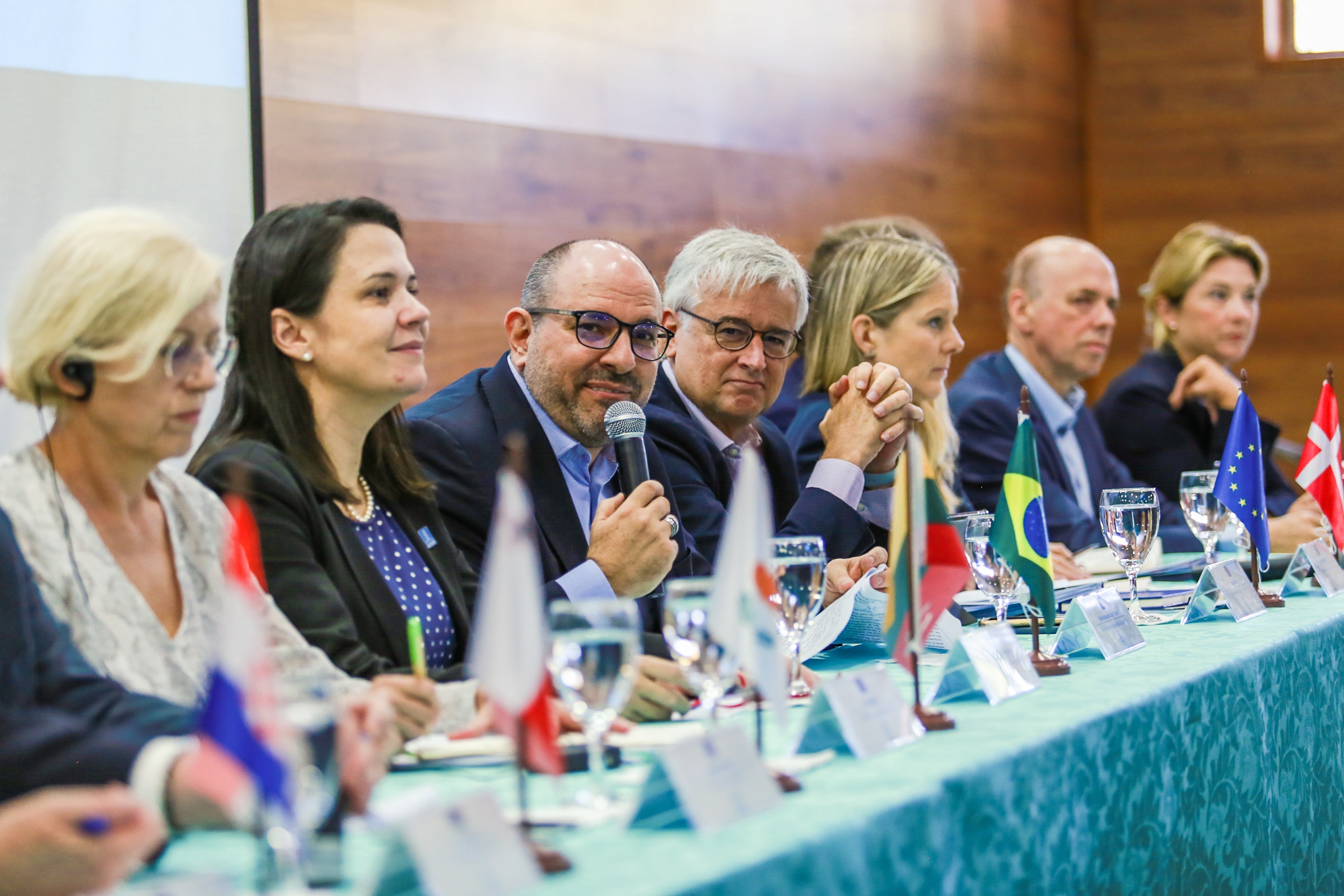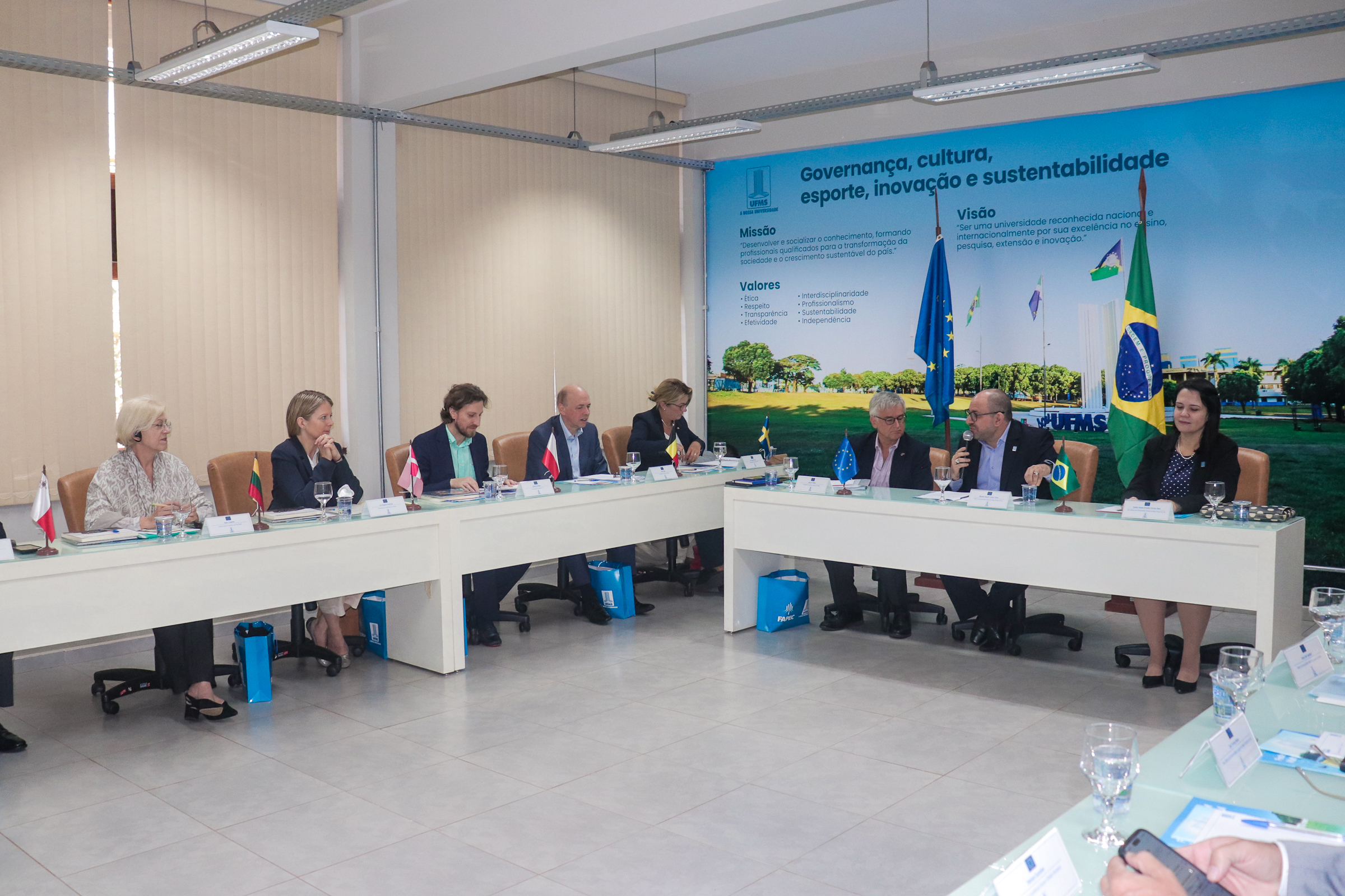 Em missão diplomática no Mato Grosso do Sul, embaixadores de países membros da União Europeia visitaram a UFMS na última sexta-feira, 26, para discutir parcerias estratégicas em prol do desenvolvimento sustentável e inclusivo. Primeiramente, o reitor Marcelo Turine e a vice-reitora Camila Ítavo receberam os 11 chefes de Estado da UE na sala de reuniões da Pró-Reitoria de Gestão de Pessoas para o evento Parceria estratégica União Europeia-Brasil em prol do desenvolvimento sustentável e inclusivo, no âmbito do MS. No encontro, reservado para reitores, foi apresentado o papel das instituições de Ensino Superior no desenvolvimento sustentável e inclusivo da região. Além do embaixador da própria União Europeia no Brasil, Ignacio Ybáñez, participaram os chefes das missões diplomáticas do Estados Membros Suécia, Bélgica, Polônia, Dinamarca, Chipre, Lituânia, Malta, Croácia, Portugal e Chéquia.