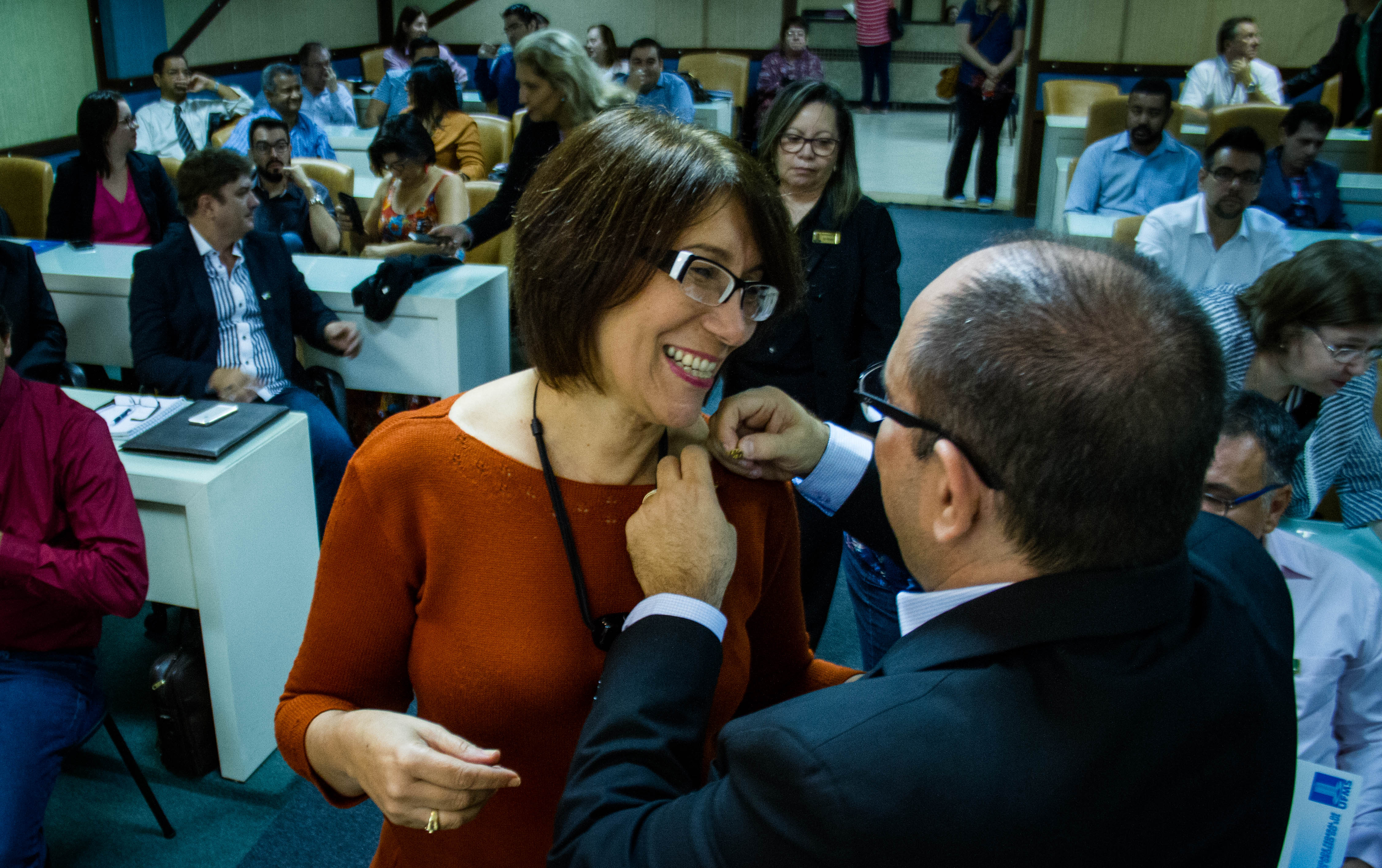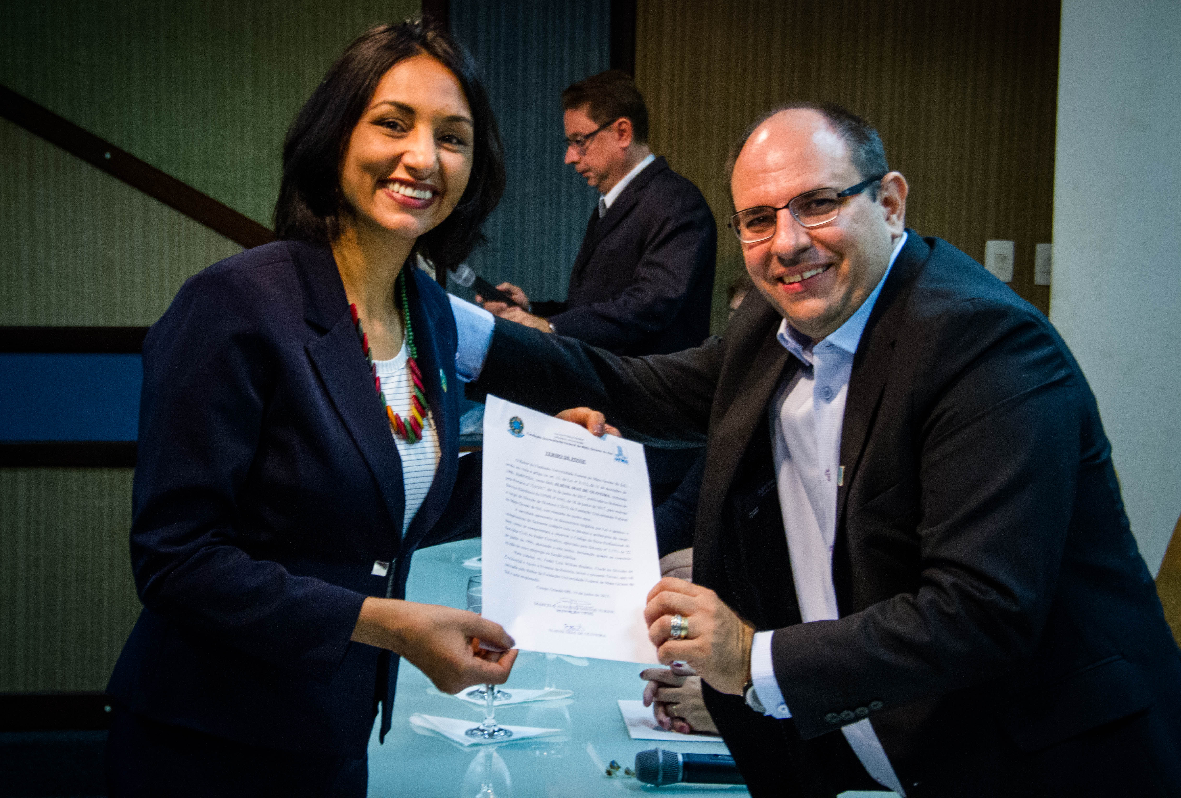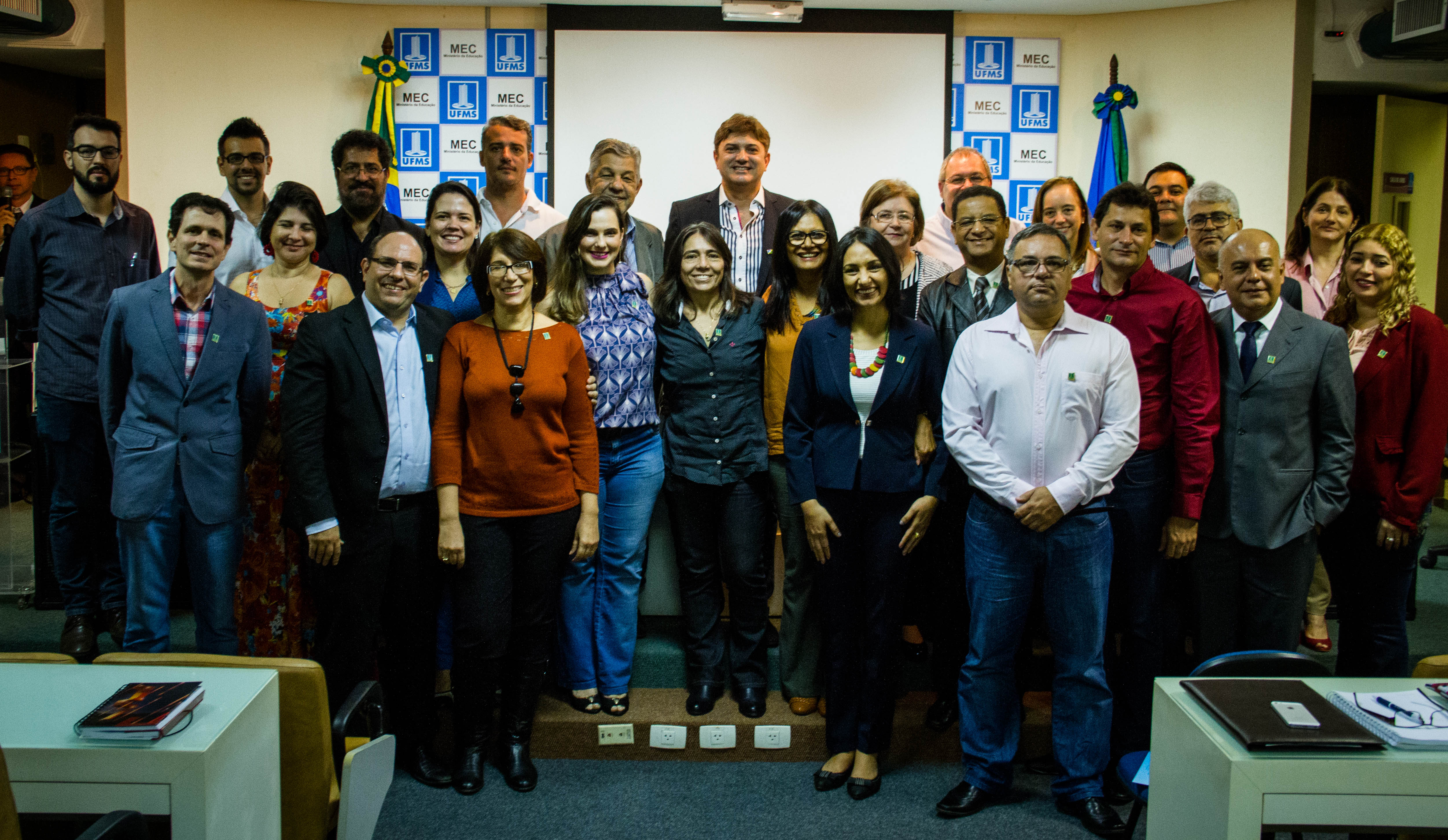 Os Diretores das novas unidades criadas nesta gestão, que já haviam tomado posse no início de junho, também estiveram presente e foram convidados a receber o bóton da UFMS: Vera Lúcia Penzo Fernandes, Diretora da Faculdade de Artes, Letras e Comunicação (FAALC); Vivina Dias Sól Queiróz, Diretora da Faculdade de Ciências Humanas (FACH); Albert Schiaveto de Souza, Diretor do Instituto de Biociência (INBIO); Luciana Contrera, Diretora do Instituto Integrado de Saúde (INISA); Maria Lígia Rodrigues Macedo, Diretora da Faculdade de Ciências Farmacêuticas, Alimentos e Nutrição (FACFAN); e Ordália Alves de Almeida, Diretora da Faculdade de Educação (FAED).