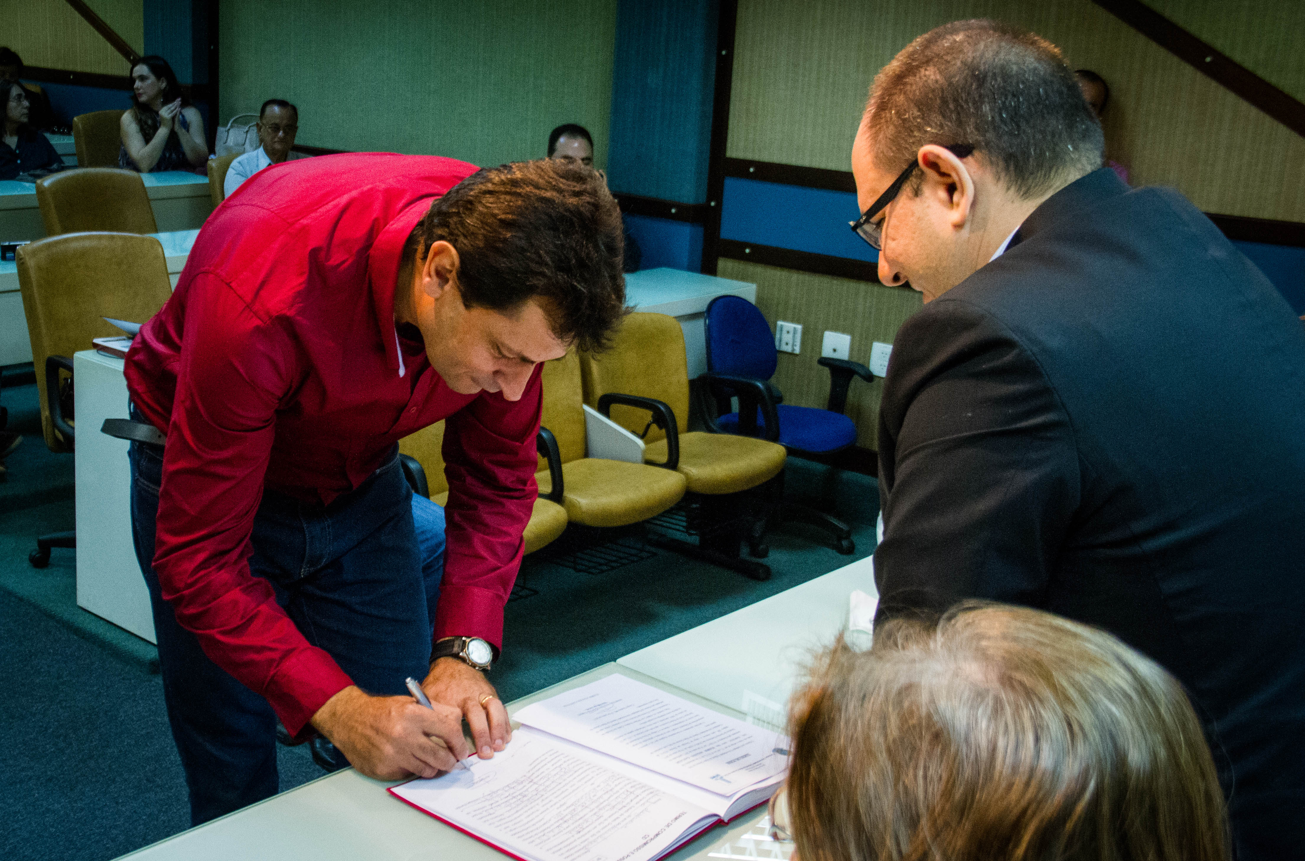 Os Diretores empossados hoje e os demais Diretores, alguns professores e técnicos-administrativos presentes à solenidade continuaram na Sala de Atos da Reitoria para uma reunião administrativa.