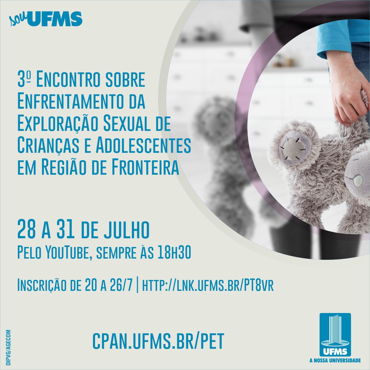 “Em razão da indicação de atividades e ações protetivas durante a pandemia da Covid-19, pelo Plano Local de Biossegurança, pensamos a terceira edição do evento de forma on-line. O nosso objetivo é proporcionar conhecimento referente a temática e possibilidade de compreensão do assunto, além de abordar sobre ações legais, políticas, municipais e educacionais presentes em Corumbá e Ladário”, destaca Suellen Carvalho de Góes Preza, acadêmica e coordenadora adjunta do projeto de extensão 3º Encontro sobre o Enfrentamento da Exploração sexual de Crianças e Adolescentes em Região de Fronteira.