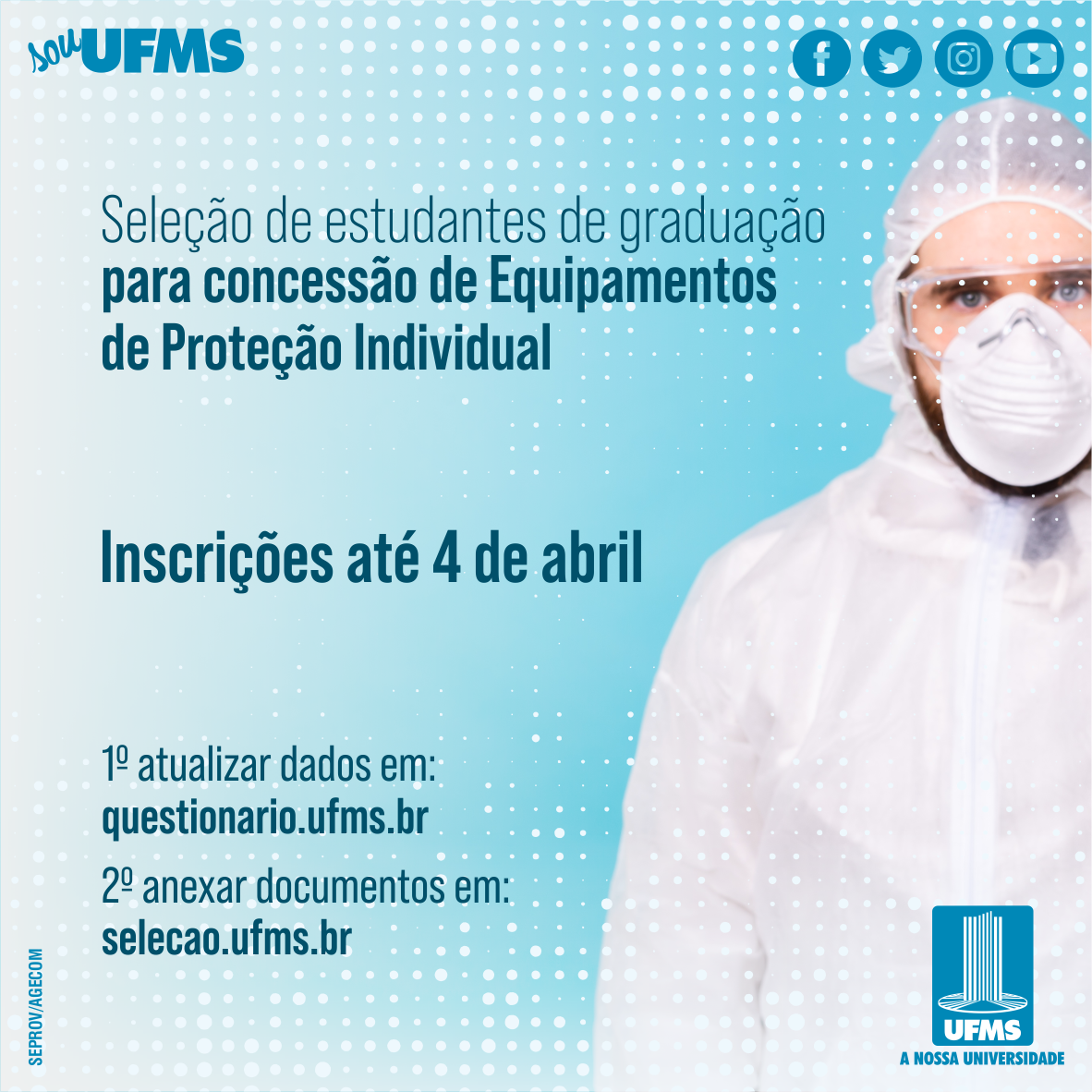 Estudantes de cursos presenciais de graduação que estejam em vulnerabilidade econômica e que tenham atividades práticas com risco biológico programadas para este primeiro semestre de 2021 podem solicitar a concessão de Equipamentos de Proteção Individual (EPIs). As inscrições podem ser feitas até 4 de abril por meio da atualização dos dados no site questionario.ufms.br e do envio de documentos pelo site selecao.ufms.br.