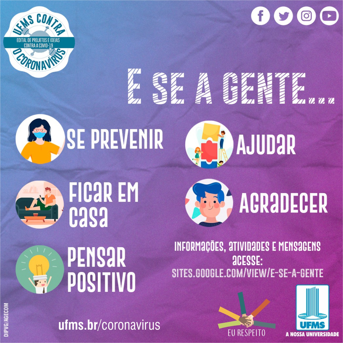 A página reúne informações para serem compartilhadas, tais como prevenção contra o Coronavírus; atividades para promover o isolamento social; ações locais de prevenção e de solidariedade; ações de pensamento positivo e agradecimento aos profissionais vinculados às atividades essenciais, entre eles os trabalhadores da área da saúde. “Estamos incluindo conteúdo na plataforma e, para pulverizar as informações, promovemos também campanhas nas redes sociais. Já realizamos uma campanha para ajudar quem precisa preencher o auxílio emergencial, com a divulgação da página que reúne informações sobre quem pode pedir o auxílio, perguntas e respostas, como regularizar o CPF e dados sobre o pagamento. Estamos definindo o cronograma das próximas campanhas”, informa o professor.