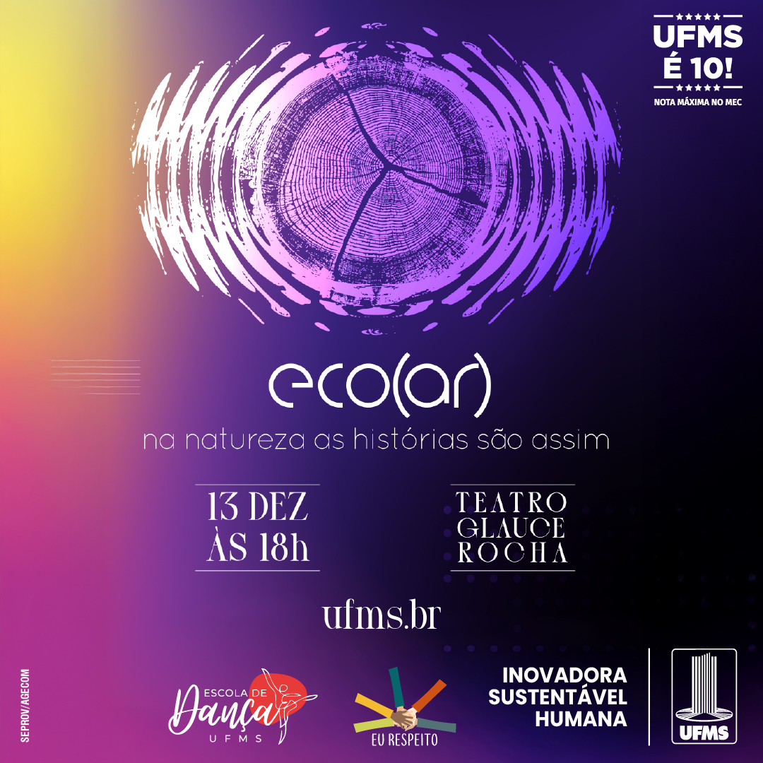 A Escola de Dança da UFMS realiza, no dia 13 de dezembro, às 18h, no Teatro Glauce Rocha, o espetáculo Eco(ar): na natureza, as histórias são assim. A apresentação encerra o calendário de atividades de 2025 e reúne 13 turmas de diferentes modalidades, que levarão ao palco uma proposta artística voltada ao diálogo entre natureza, sensibilidade e criação coletiva. A entrada é gratuita, aberta ao público e os ingressos podem ser reservados neste link.