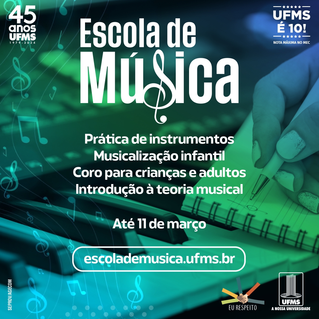“As inscrições para o Programa Escola de Música da UFMS estão abertas até o dia 11 de março, vocês podem se inscrever tanto em aulas para instrumento, quanto em aulas de teoria musical, e todos são muito bem-vindos. Não cobramos mensalidade, é uma pequena taxa de inscrição e vocês vão ter um semestre maravilhoso com os nossos professores e nossos bolsistas, prontos e preparados para recebê-los com o maior carinho e amor”, convida o pró-reitor.