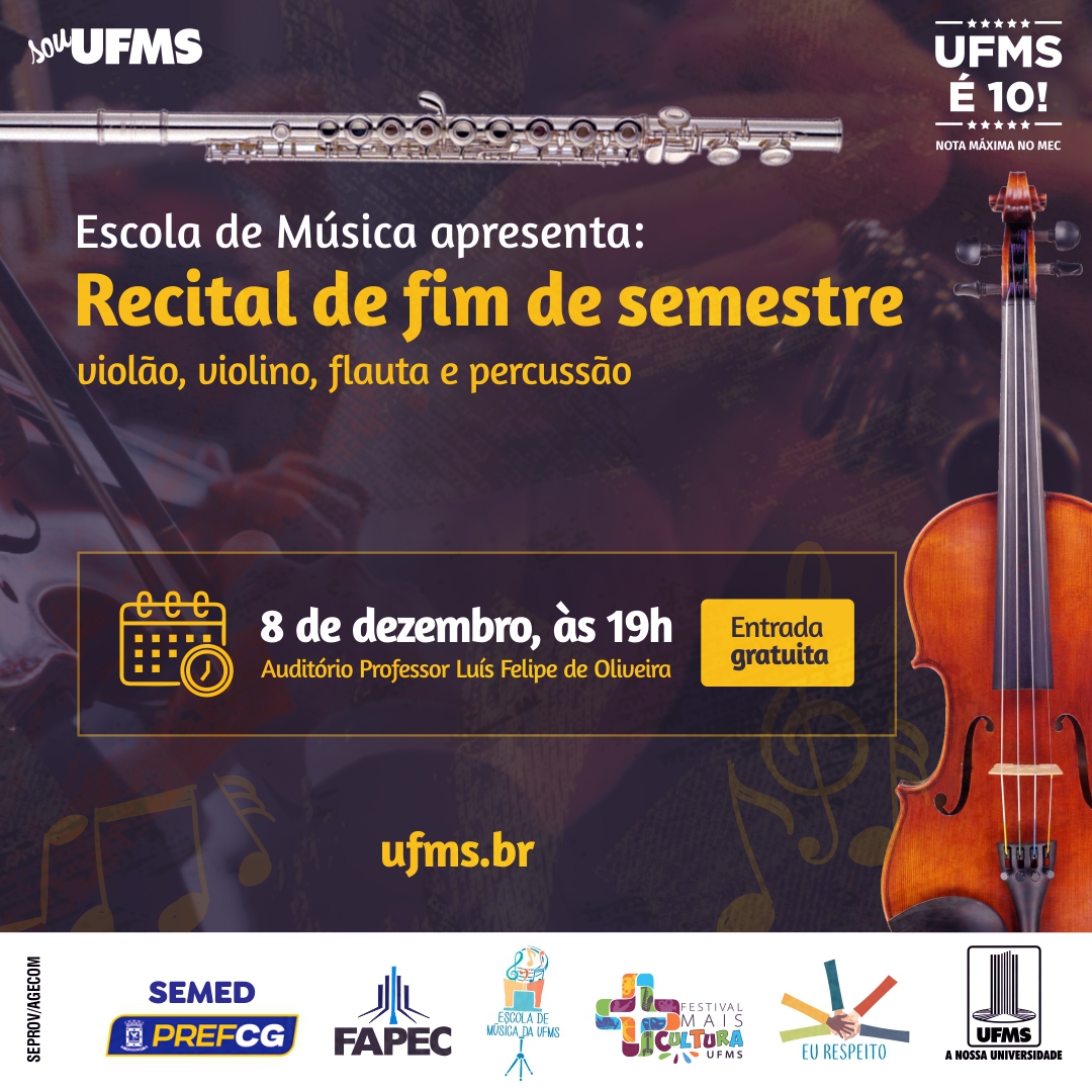 Para celebrar o fim de um ano de conquistas, a Escola de Música da UFMS convida para o recital de encerramento do semestre na próxima sexta-feira, 8, às 19h, no Auditório Professor Luís Felipe de Oliveira. O evento marca o término de mais um ciclo de aprendizado, celebrando o talento e dedicação dos participantes. A apresentação terá as turmas de violão, violino, flauta e percussão. A entrada é franca e aberta para toda comunidade.