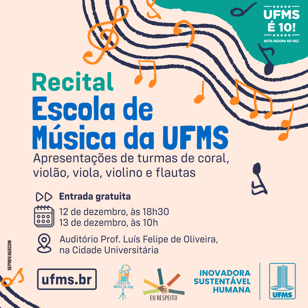 Para celebrar o encerramento das atividades de 2025, a Escola de Música da UFMS realiza o recital de conclusão de semestre nos dias 12 e 13 de dezembro, às 18h30 e 10h, respectivamente, no auditório Prof. Luís Felipe de Oliveira, localizado no setor 3 da UFMS de Campo Grande. O evento também exibe os trabalhos desenvolvidos no curso de Música da Faculdade de Artes, Letras e Comunicação (Faalc) e nos projetos de extensão oferecidos à comunidade. A entrada é gratuita e aberta ao público.