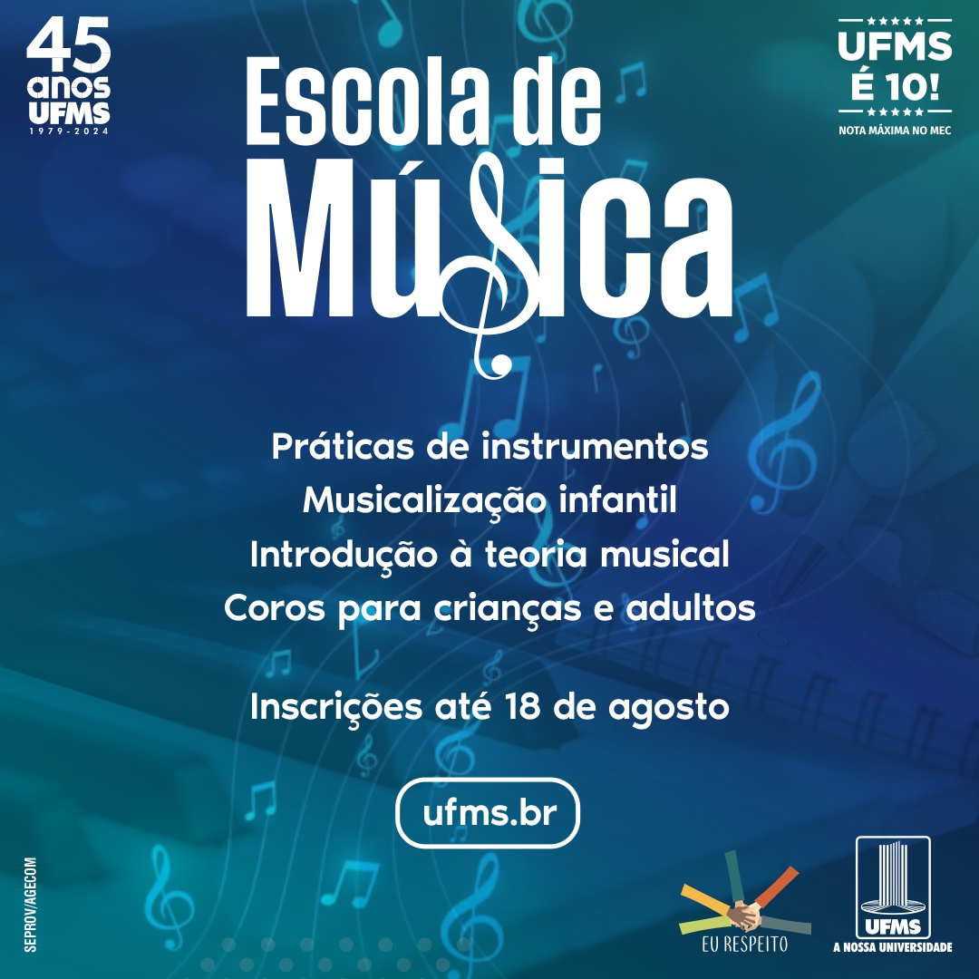 A Escola de Música da UFMS está com inscrições abertas até domingo, 18, para atividades no segundo semestre. A iniciativa oferece 385 vagas para a prática de instrumentos musicais de corda e sopro, atividades de musicalização infantil, participação em corais e em aulas de teoria musical. As inscrições estão abertas para toda a comunidade e os interessados devem realizar o preenchimento do formulário disponível na página do Programa.