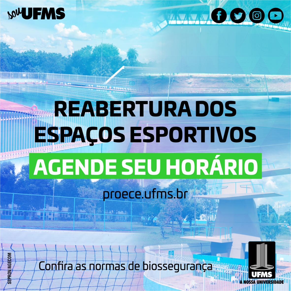 O Complexo Aquático, as Quadras Poliesportivas e a Pista Atlética do Estádio Pedro Pedrossian estão liberados para uso dos servidores e estudantes da Cidade Universitária. Para tanto, é necessário realizar o agendamento prévio e seguir as normas de biossegurança.