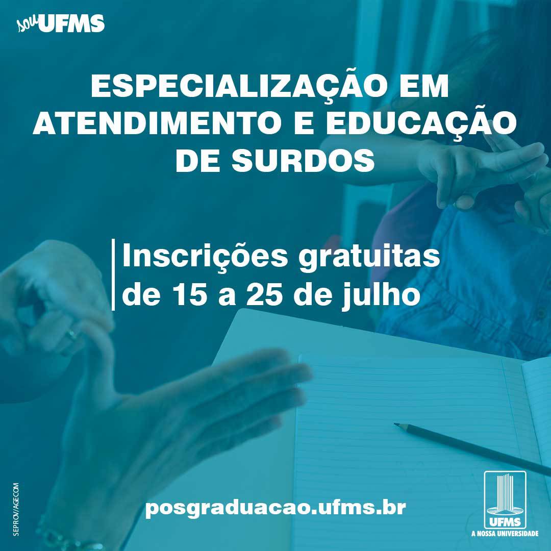 Terminam hoje,25, as inscrições para o processo seletivo da especialização em Atendimento e Educação de Surdos em Espaços Escolares. Estão sendo oferecidas 300 vagas, sendo 60 destinadas para ações afirmativas. A formação tem por objetivo contribuir para a formação continuada de professores que atuam nos Sistemas de Ensino da Educação Básica, e nos atendimentos especializados da área de Educação bilíngue de surdos.