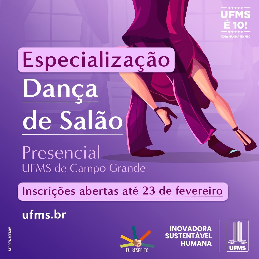 De forma inédita em Mato Grosso do Sul, a UFMS, por meio da Faculdade de Educação (Faed), oferta o curso de Especialização em Dança de Salão, voltado para ampliar os conhecimentos de diferentes profissionais em relação à prática e a teoria na área. As inscrições podem ser feitas até 23 de fevereiro nesta página. Ao todo, são oferecidas 44 vagas para ingresso no ano de 2026, distribuídas em ampla concorrência, ações afirmativas e vulnerabilidade socioeconômica.