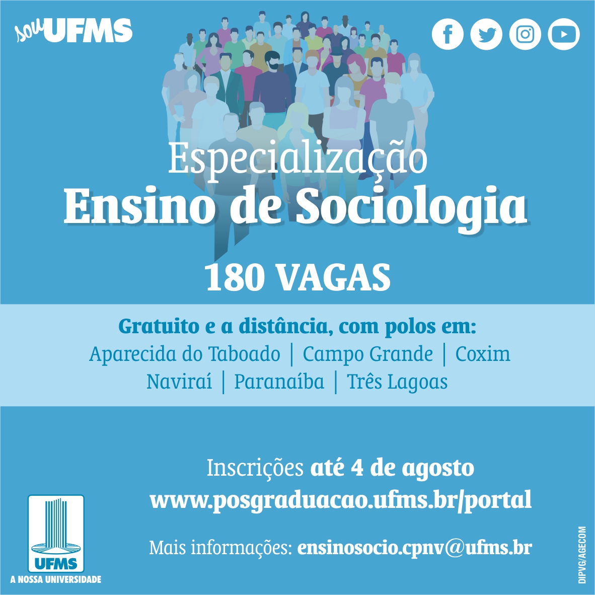 As inscrições para a Especialização em Ensino de Sociologia, ofertada gratuitamente e na modalidade a distância pela UFMS, podem ser feitas até 4 de agosto. Ao todo são 180 vagas distribuídas nas cidades de Aparecida do Taboado, Campo Grande, Coxim, Naviraí, Paranaíba e Três Lagoas, com reserva para ações afirmativas. Interessados devem acessar o Portal da Pós-graduação.