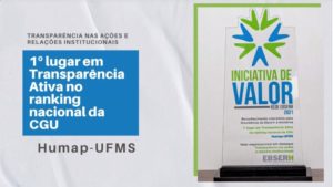 Ontem, 15, o Humap-UFMS foi premiado pelo segundo ano consecutivo com o Troféu Iniciativa de Valor, na categoria Transparência nas Ações e Relações Institucionais. Este ano, a classificação é consequência do Hospital Universitário ter conquistado o 1º lugar em Transparência Ativa no ranking nacional da Controladoria Geral da União (CGU). Veja mais aqui.